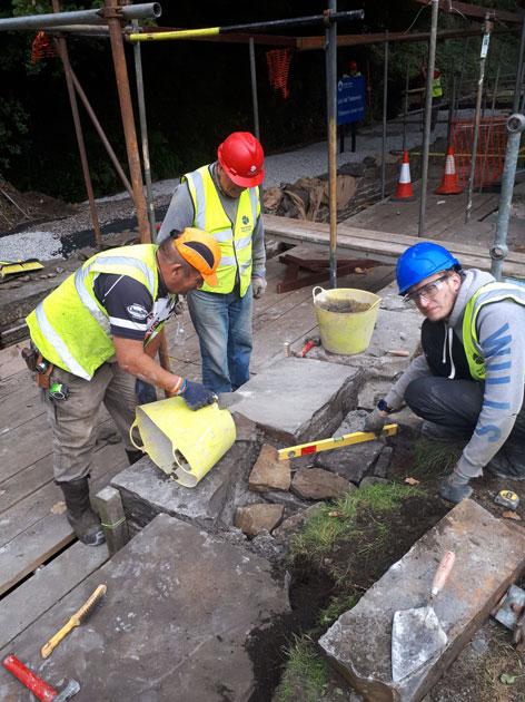 Gordon, Colin & Will move a heavy stone into position before fixing it in place.
