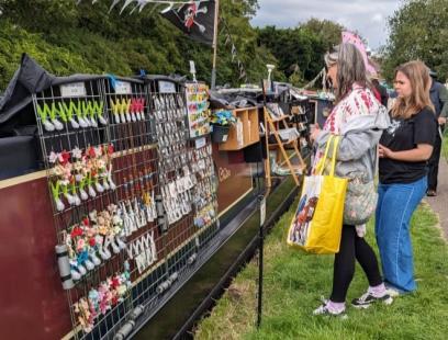 The Linslade Canal Festival took place on 29 July, with its usual pleasant mix of trading and historic boats, craft demonstrations, entertainment and catering. Although IWA Milton Keynes Branch did not attend, Buckingham Canal Society did, and Athina and colleagues did brisk trade with their Retro Recyclables stall. Photo: Les Franklin.