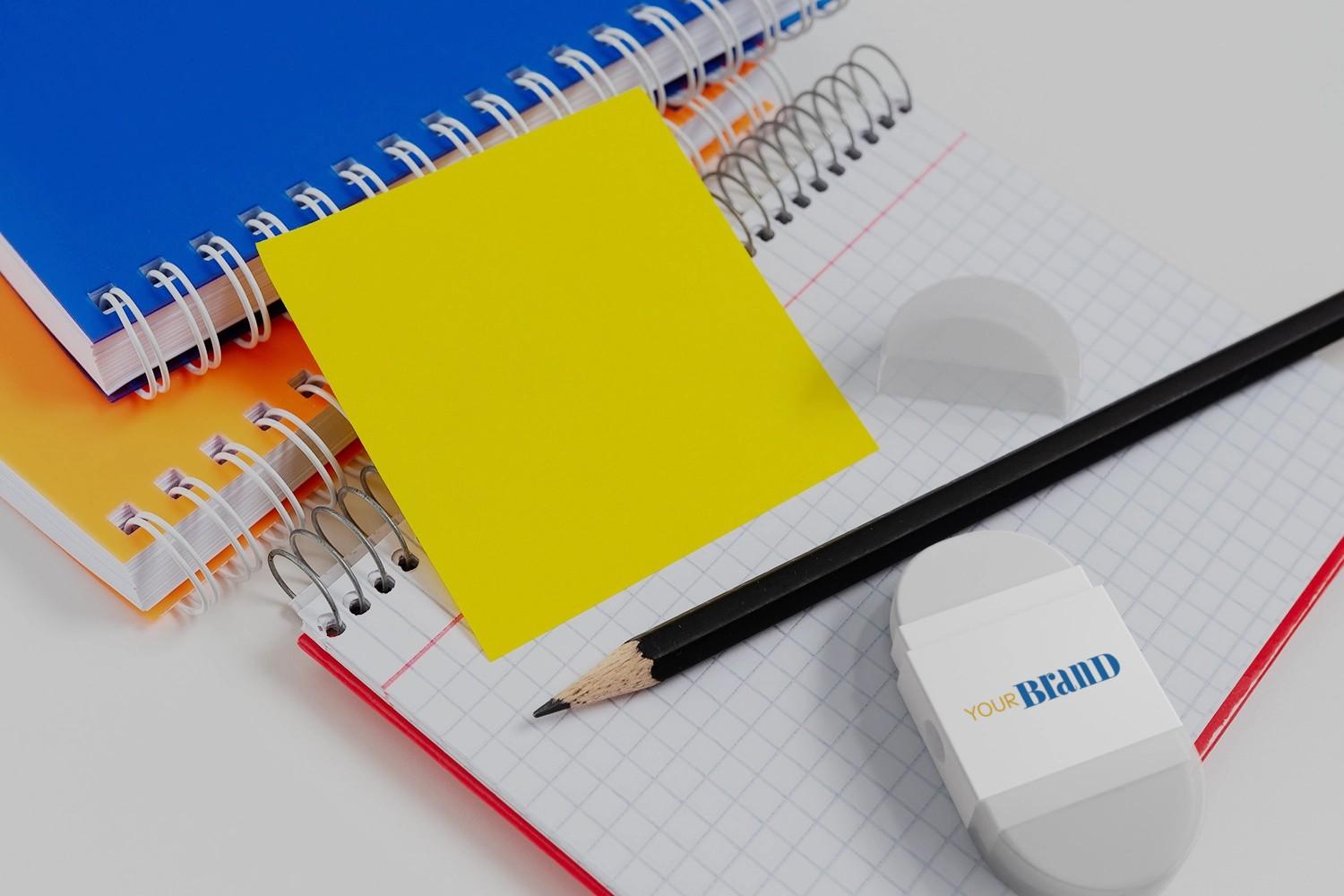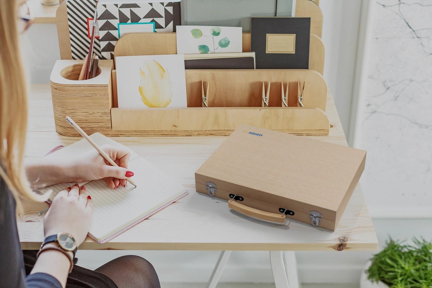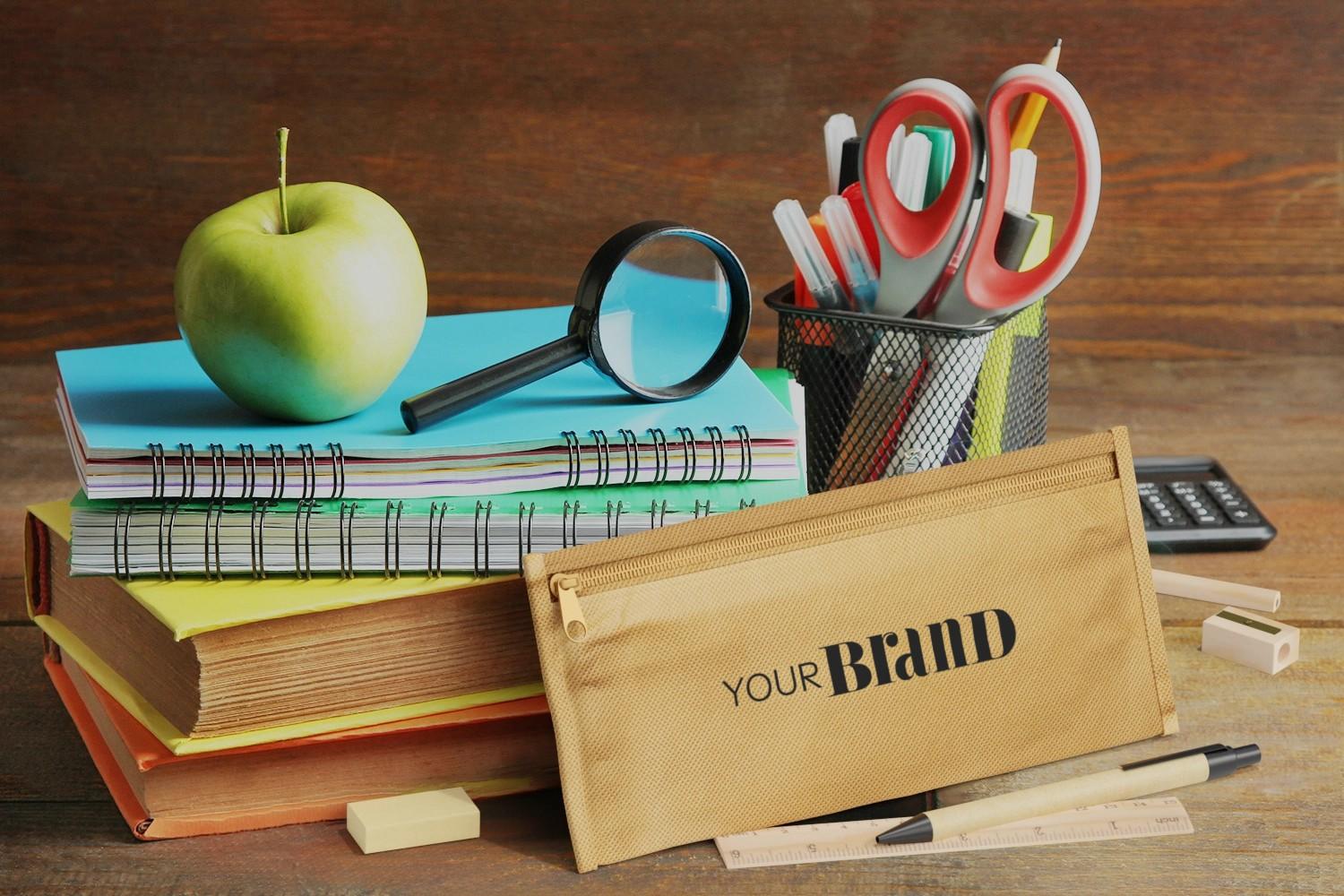 Pencil case with ballpoint pen, pencil, ruler, pencil sharpener, and notepad. Recyclable PP Plastic, Wood.