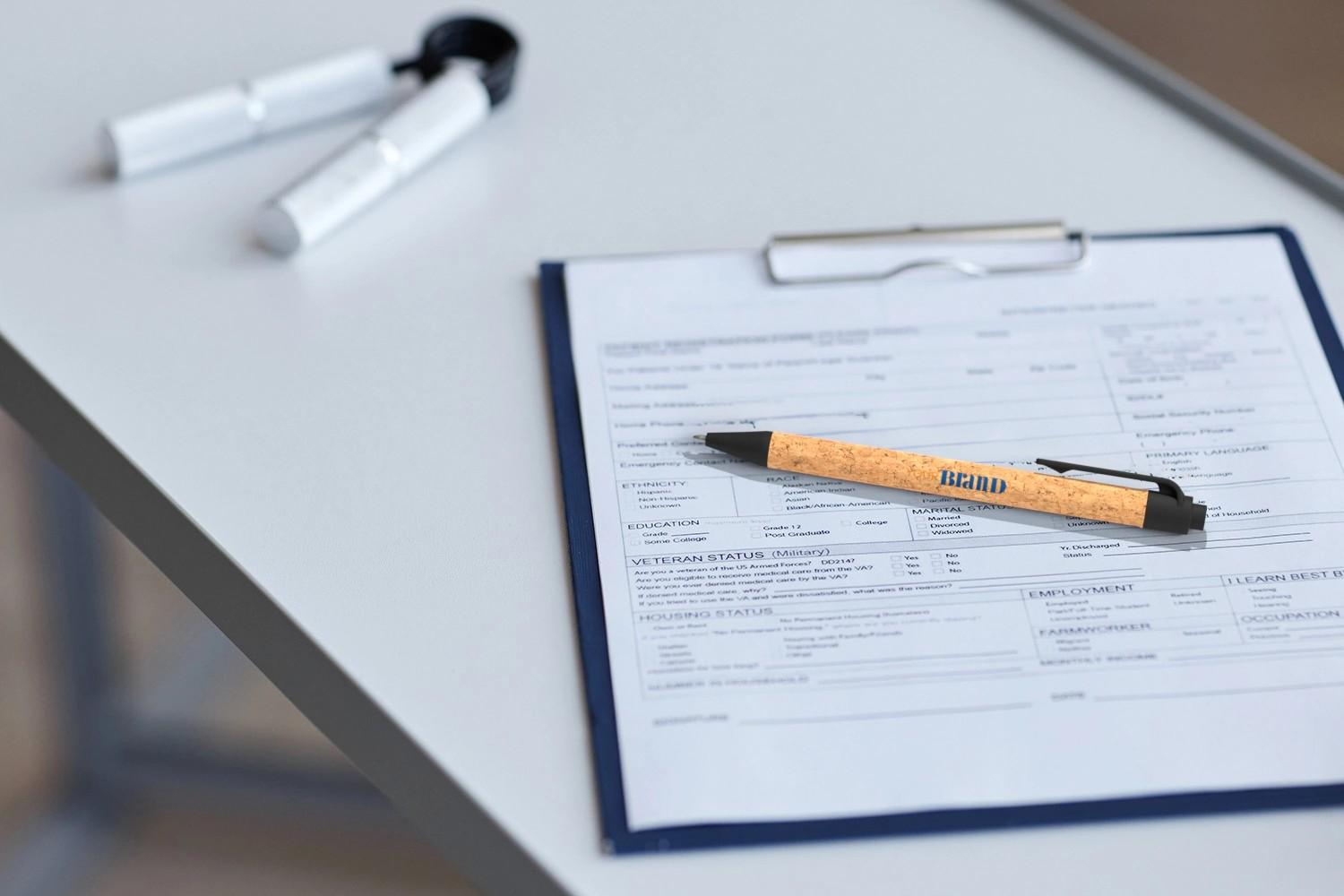 Eco friendly ballpoint pen with click action mechanism, with a barrel made of cork, and wheat straw trims that comes in a variety of colours. Wheat straw is left over stalk after wheat grains are harvested. This reduces the amount of plastic used, providing an Eco friendly alternative. The colour of the cork material may vary. Cork, Wheat straw, Plastic.