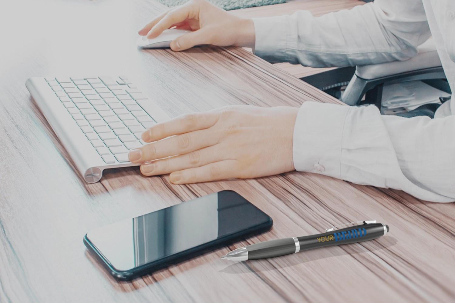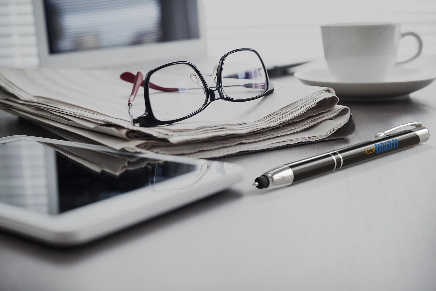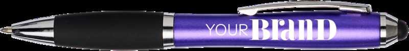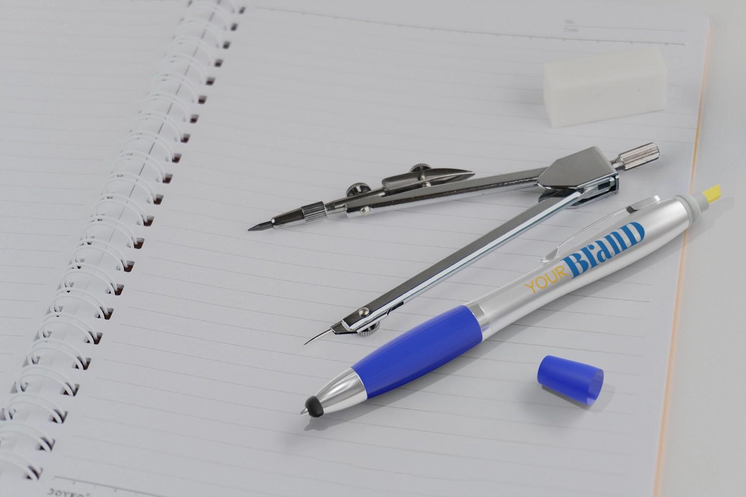 Twist action mechanism stylus ballpoint pen with highlighter and soft touch grip. ABS Plastic.