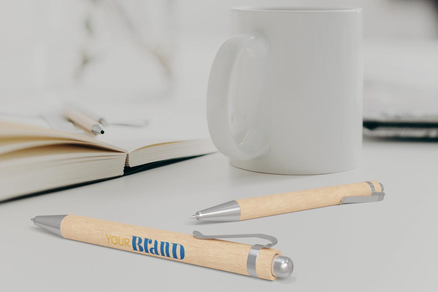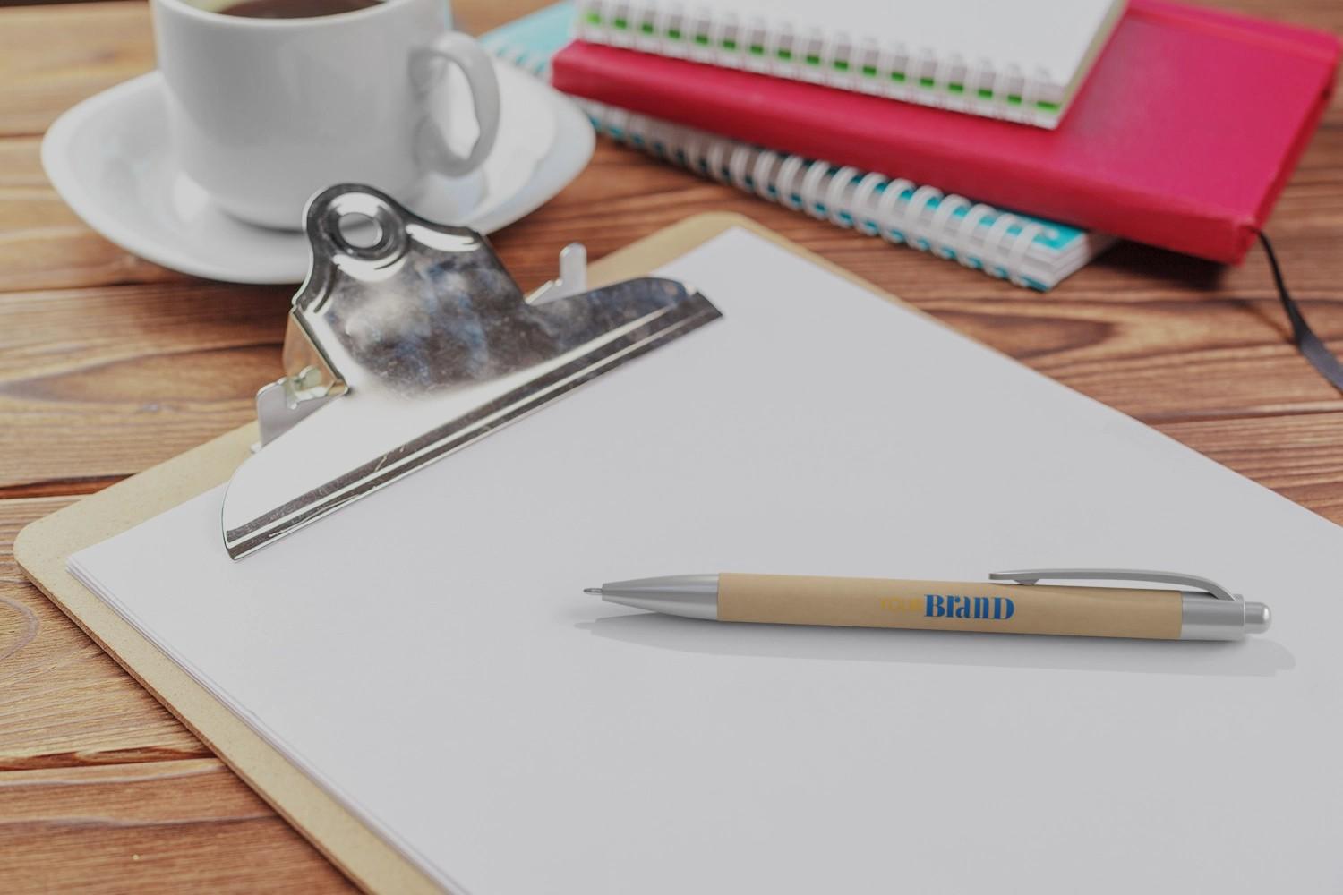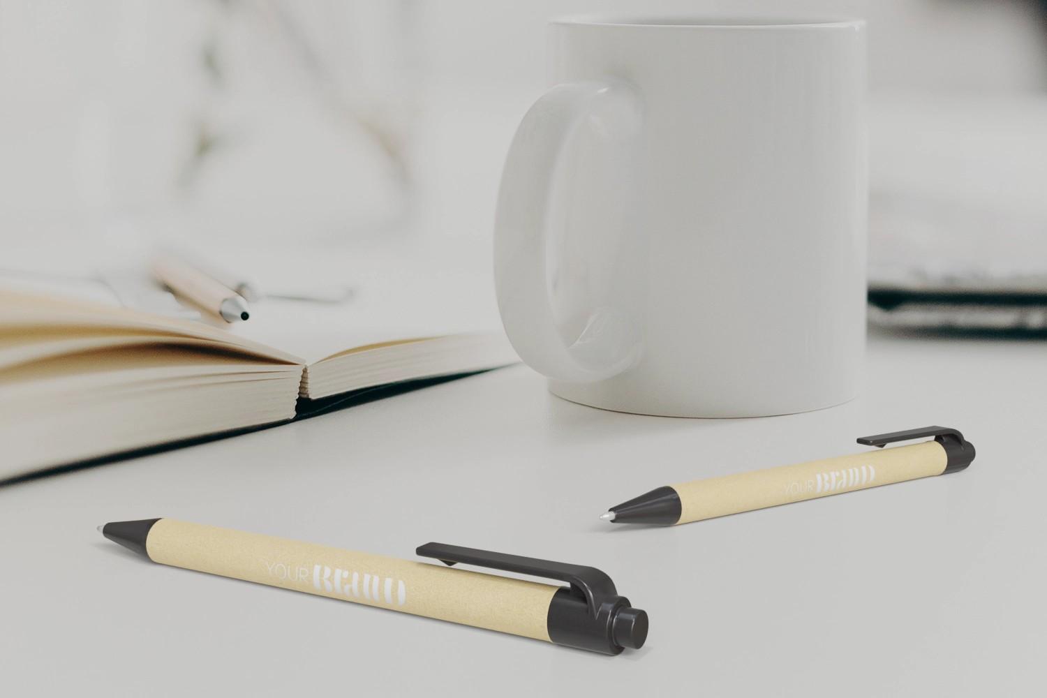 Eco friendly ballpoint pen with click action mechanism, with a barrel made of biodegradable paper material, and corn plastic trims that comes in a variety of colours. Recycled carton colour may vary. Recycled carton, Corn plastic.
