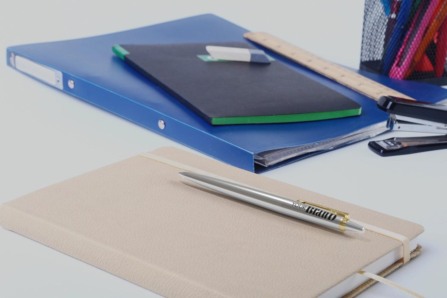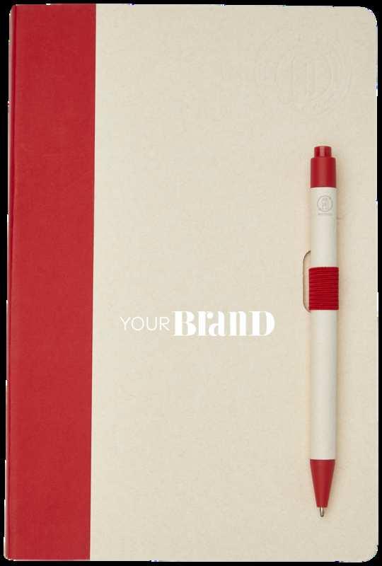 Recycled paper cover notebook with 60 sheets of lined recycled reference paper with matching pen. Pens packed together with notebook. Recycled paper.