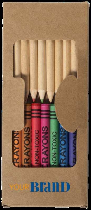 6 coloured wax crayons. Decoration not available on components. Cardboard.