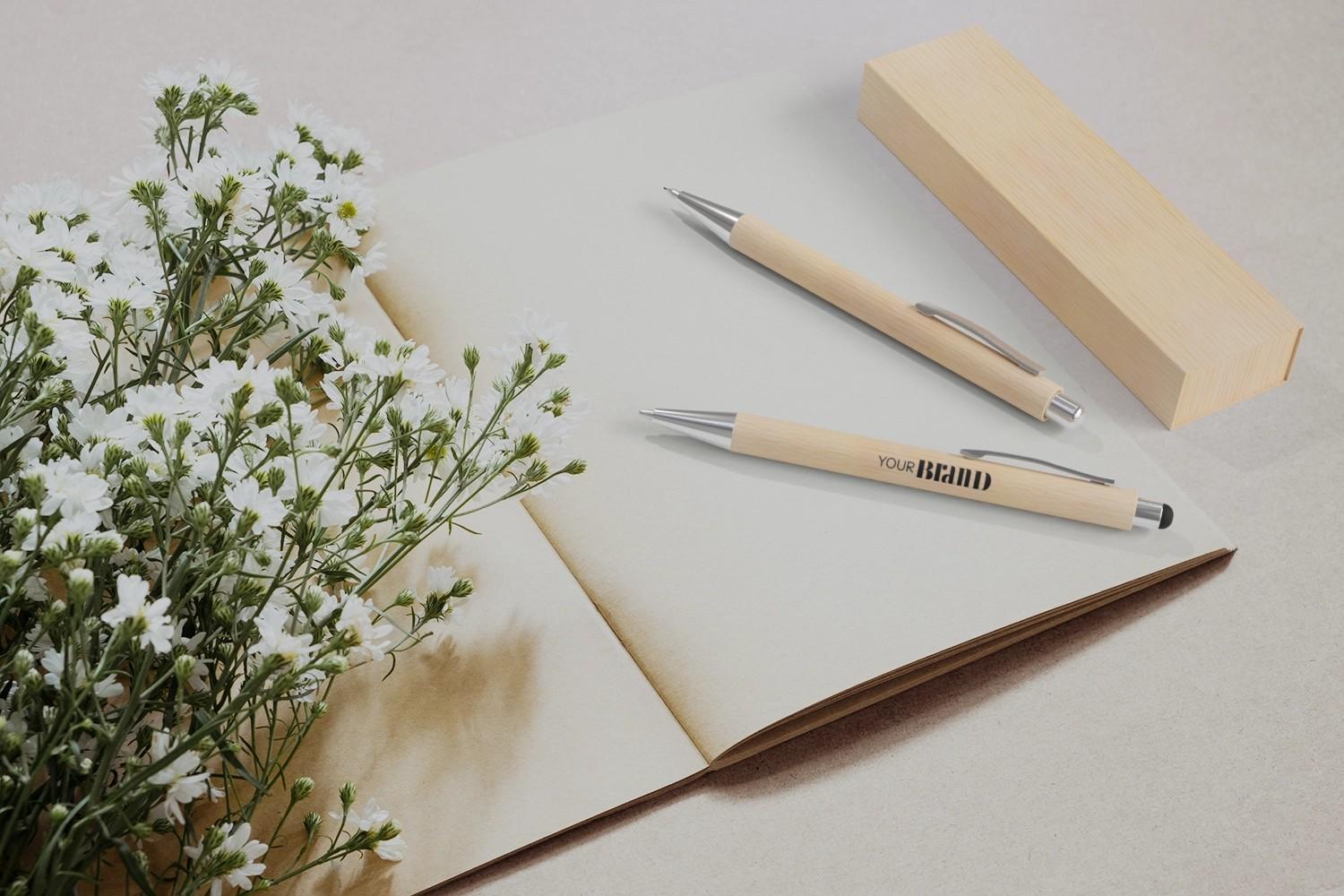 The Oblys set consists of a ballpoint pen and a mechanical pencil, both with barrels made of bamboo. The ballpoint pen has a black stylus and chromed metal clip. Ink colour: Black. Nib size: 1.00 mm. Writing length: 600 metres. The mechanical pencil also has a chromed metal clip. Nib size: 0.5