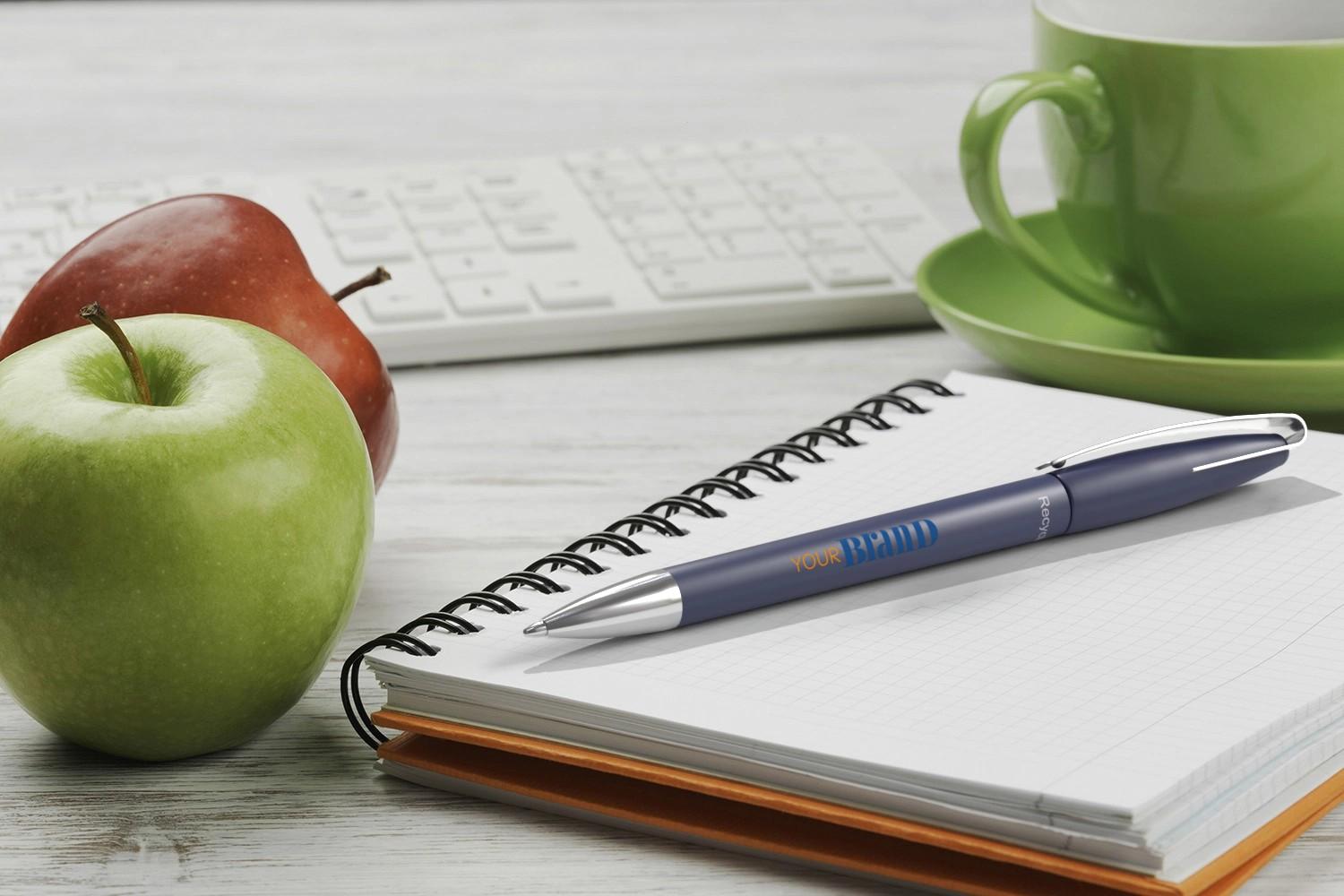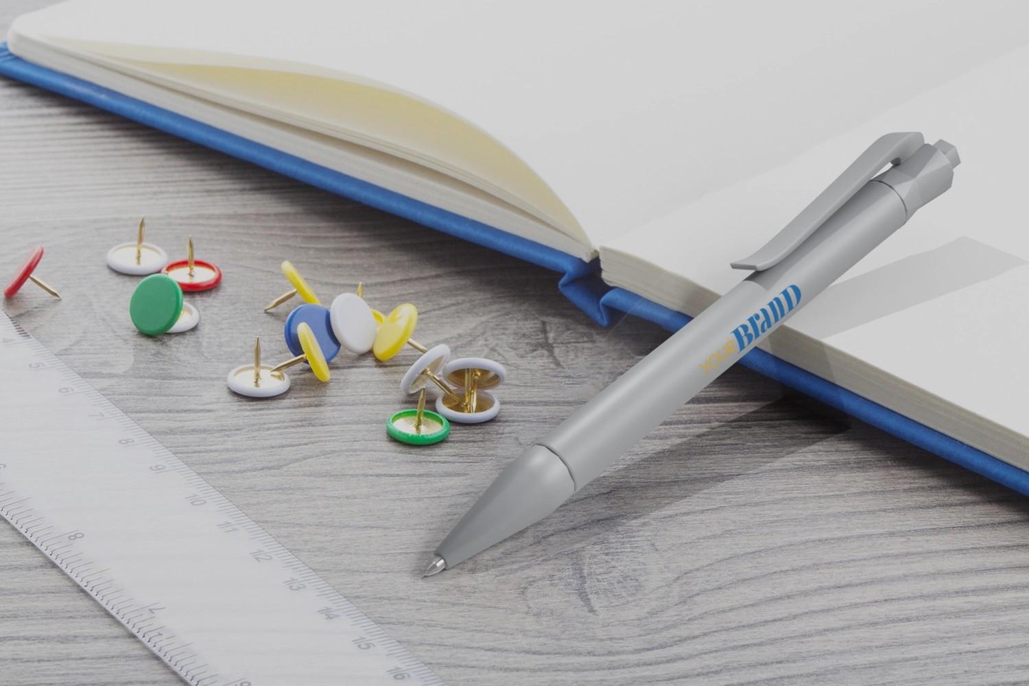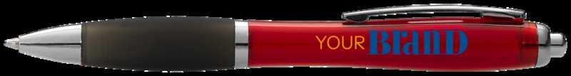 Ballpoint pen with click action mechanism and soft touch grip. ABS Plastic.