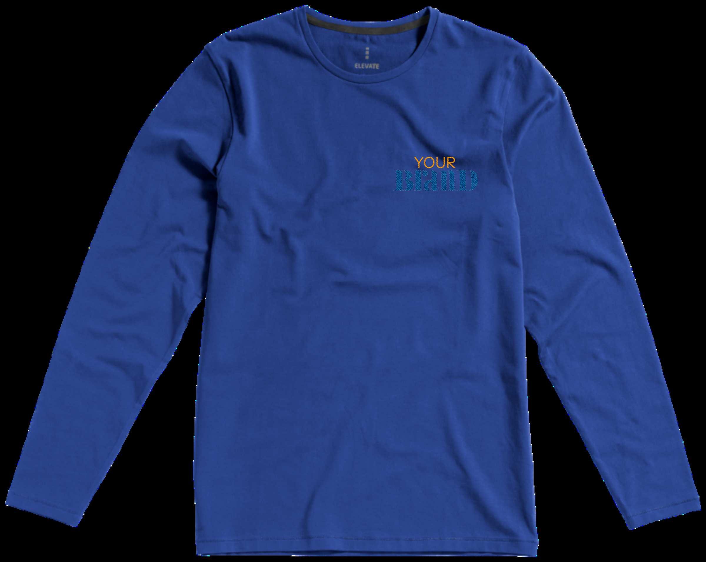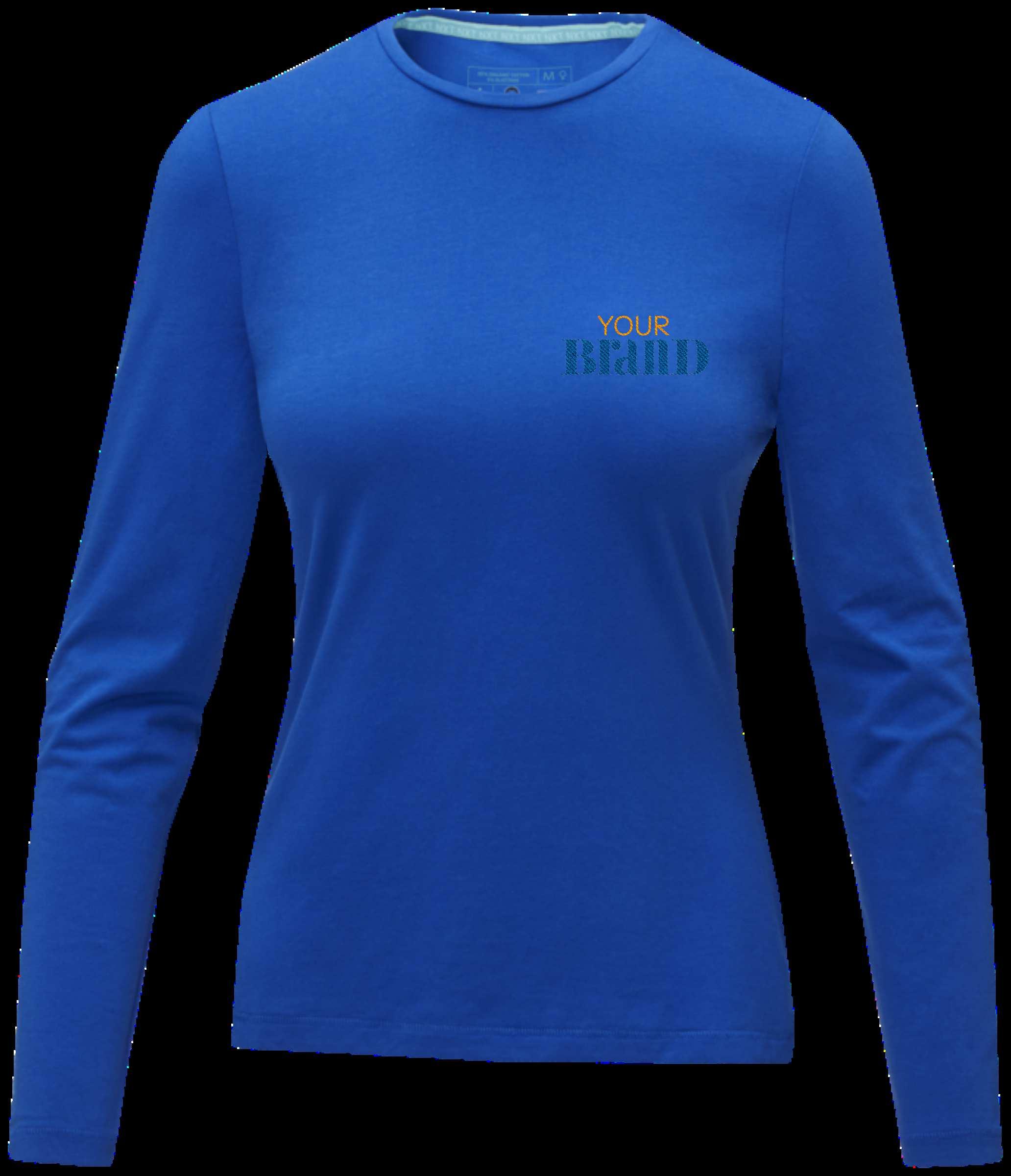 Semi fitted long -sleeve t-shirt with fine trimmed neck. No cuffs. Side seams. Removable label. Single Jersey knit of 100% Cotton, 160 g/m2.