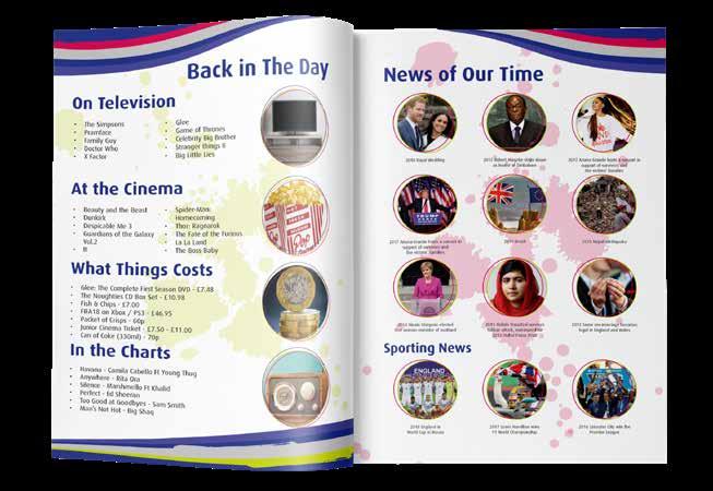Broaden your memories of your time at school with feature pages which look at events both in and outside of school. Popular options include timelines, back in the day pages which highlight the things you are interested in and capture the popular culture of the era and big news stories from your time at school. Check out these design ideas for inspiration.