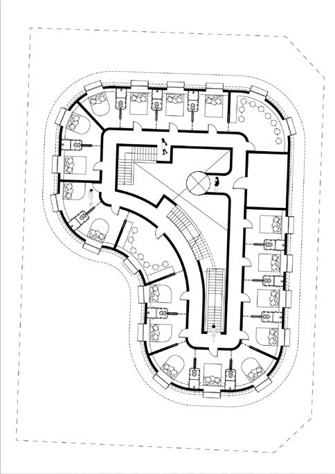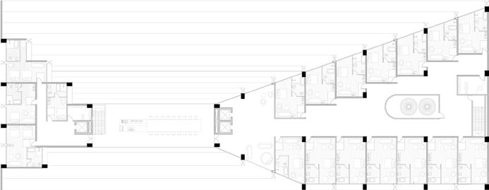 The shared kitchen is not actually a true shared kitchen. Its true purpose is as a social trigger space on the second floor. Communal dining is the best catalyst for social interaction.