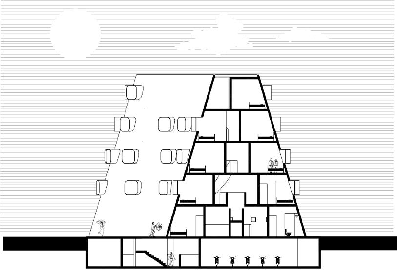 The building's facade is inclined inward, releasing a sense of oppression and giving the city a chance to breathe. The outward-projecting window frames also eliminate people's identification with floors above the second level. The occupants of the rooms also gain more privacy.