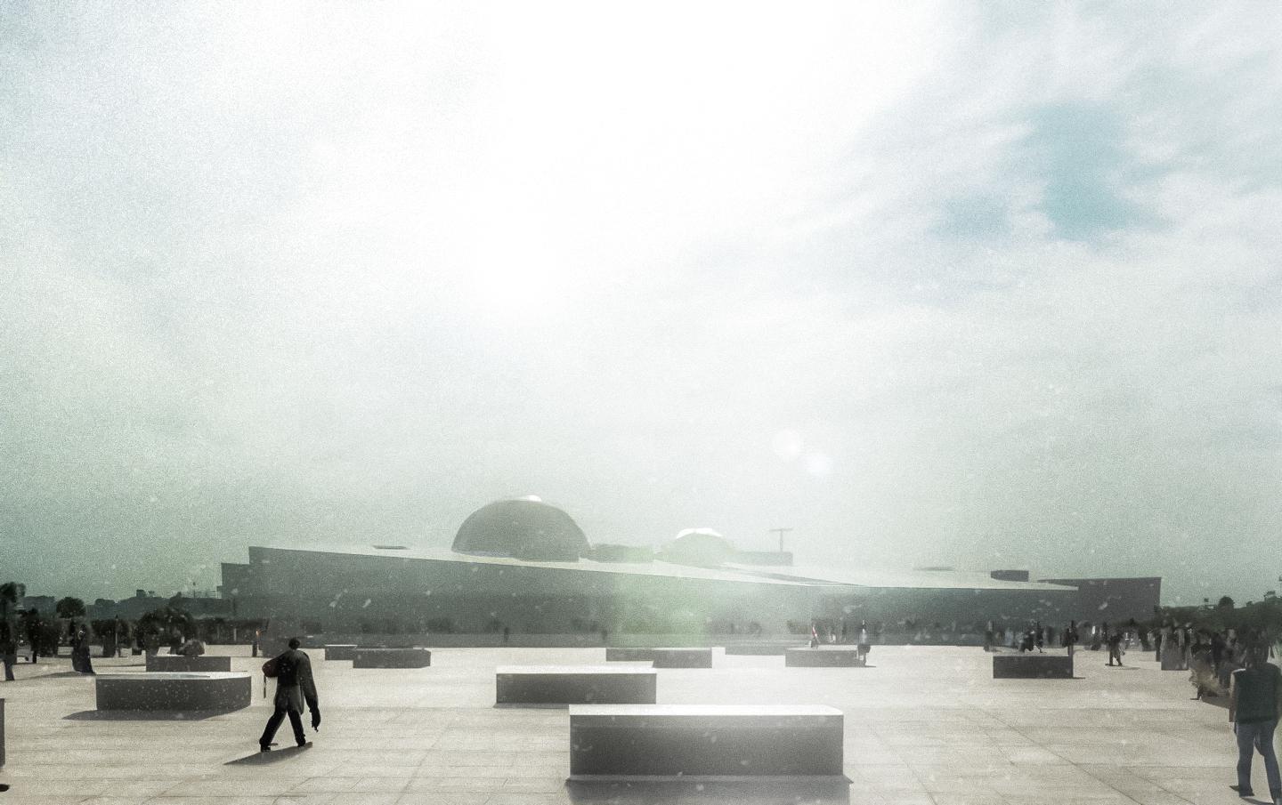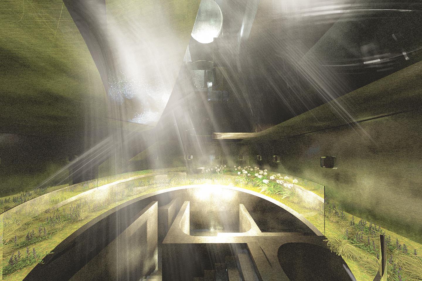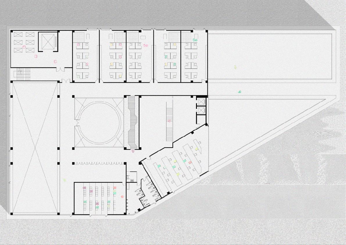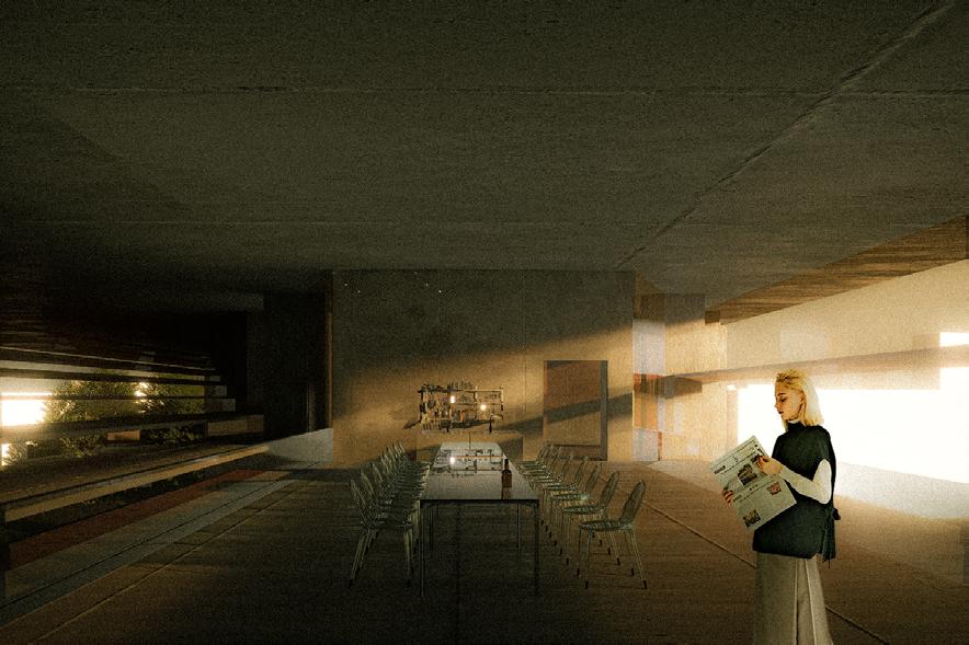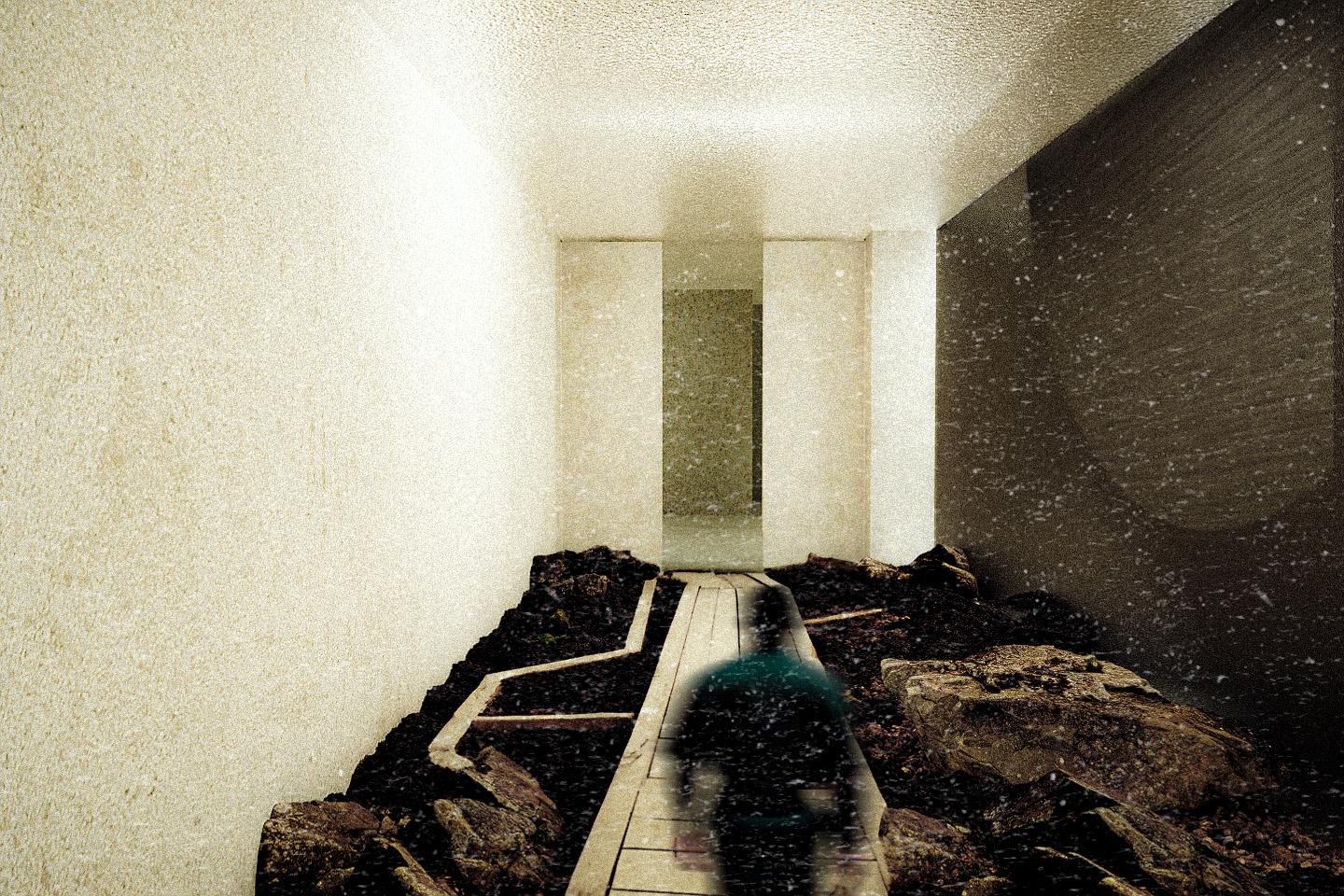 The interior of the first floor has introduced a grassy area that allows people to notice different areas under the massive metal structure. Using two different experiences to create a spatial atmosphere, cherishing each other in a gradually withering space.