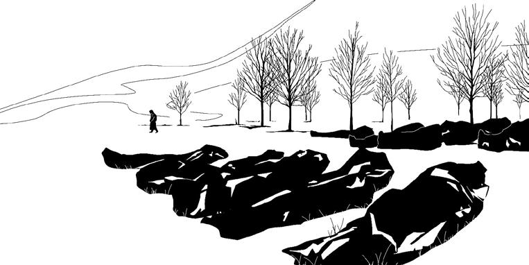 I placed the intersection beside the roadway and three walls, and added trees to create a positive space that separates incoming travelers from the outer lanes. This also causes a change in the urban speed limit. The design is compatible with the scale of pedestrian traffic and opens up romantic assumptions for couples.