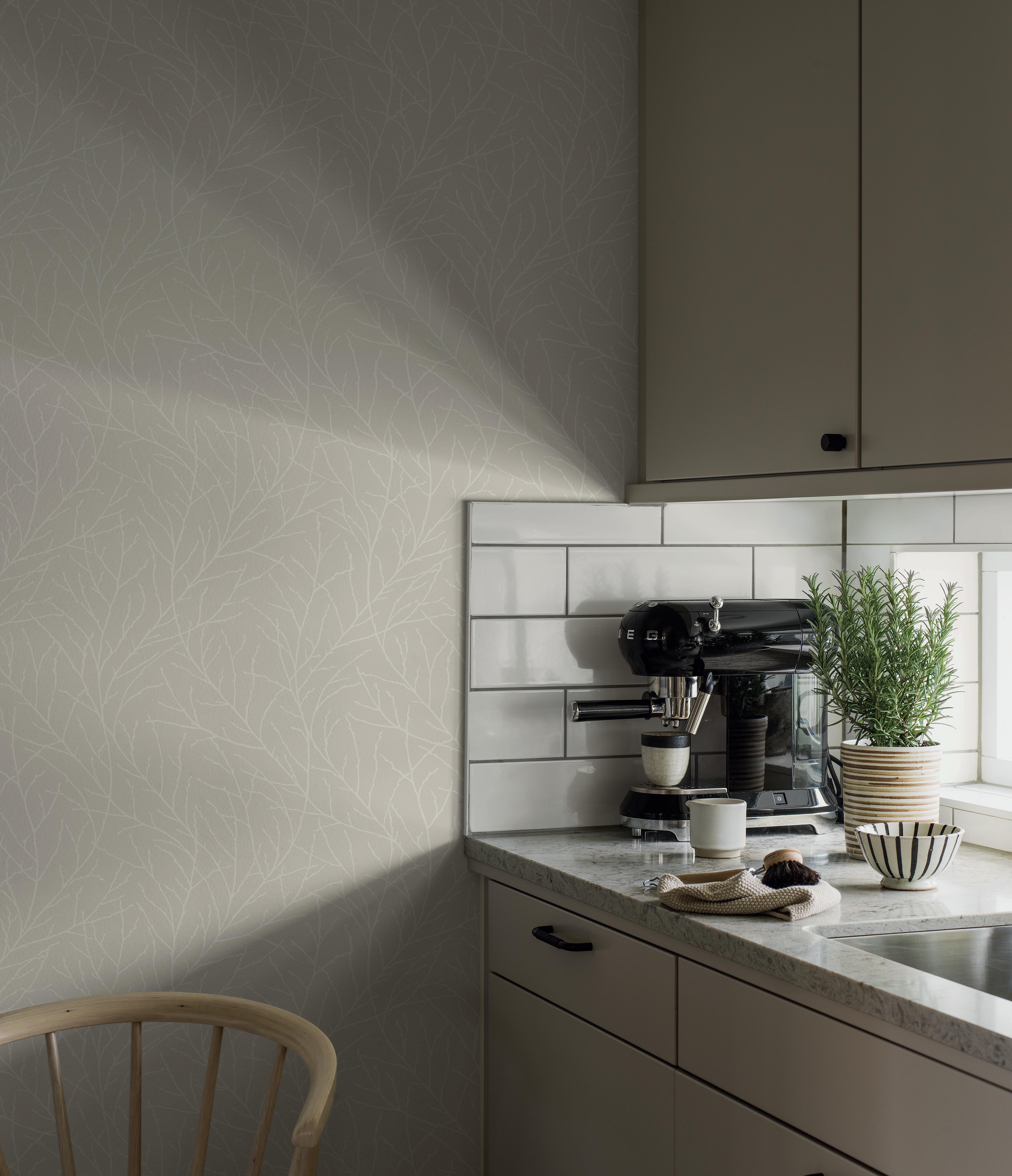 En tidlös och diskret bladslinga som passar i alla typer av rum. Bladverket ger väggen ett levande uttryck, samtidigt som ytan upplevs enfärgad på håll.