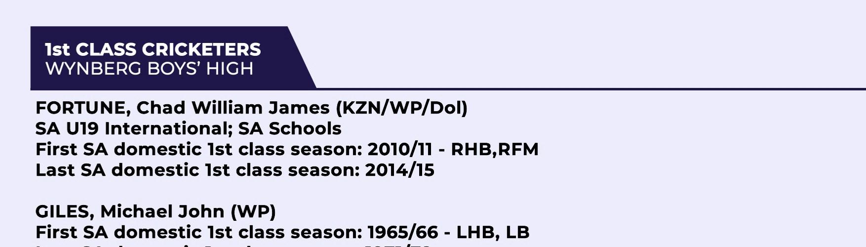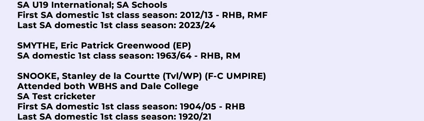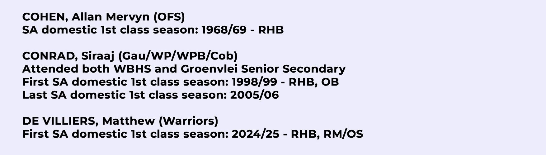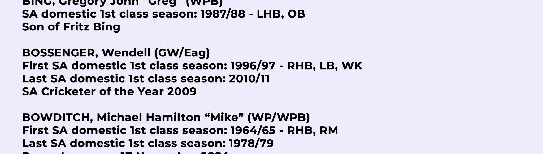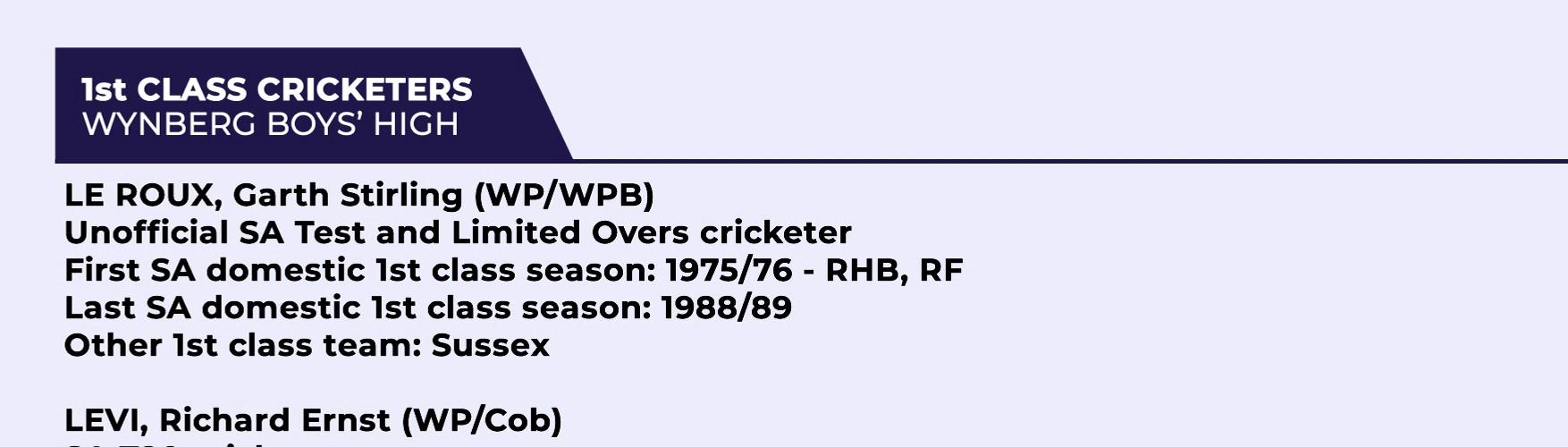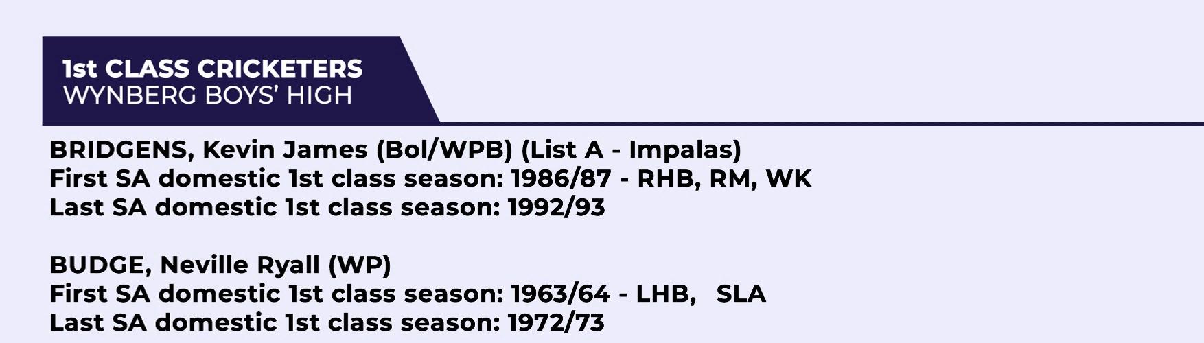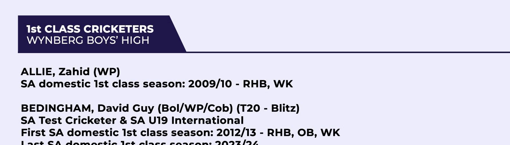 The full list of Wynberg Old Boys who've played first-class cricket, research courtesy Robin Isherwood. Register updated 6 December 2024: Matthew de Villiers debuts; we record the passing of Mike Bowditch; International status added for Jason Smith. #SuperaMoras
