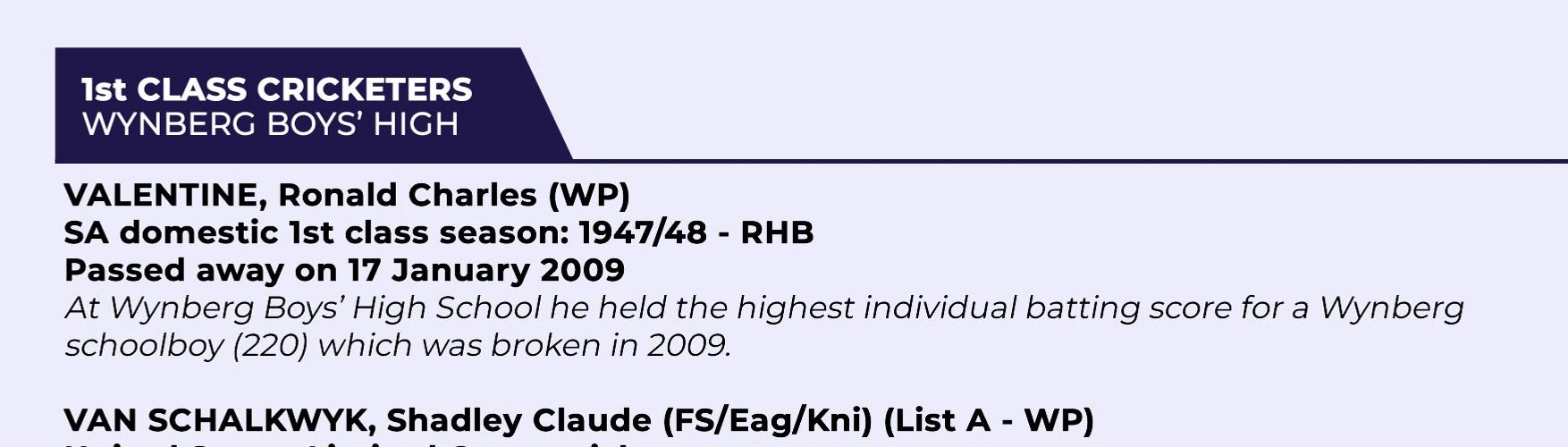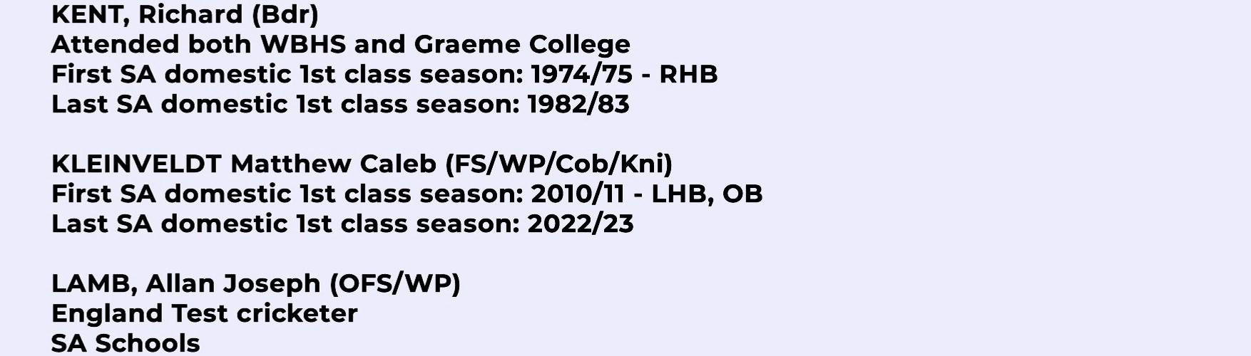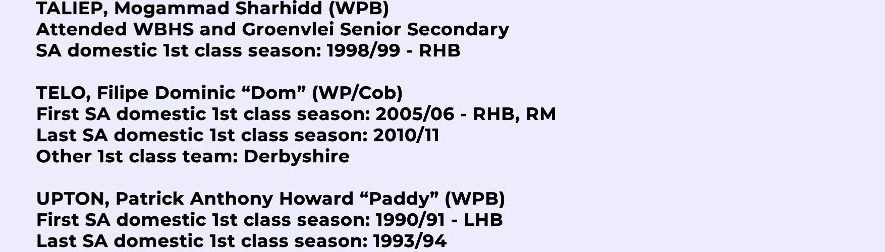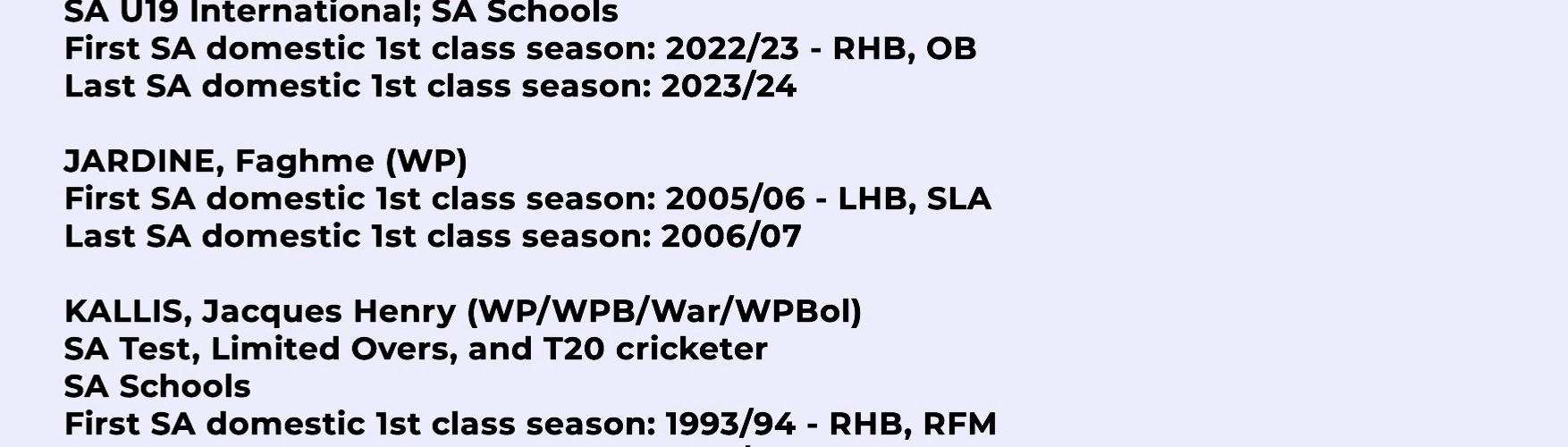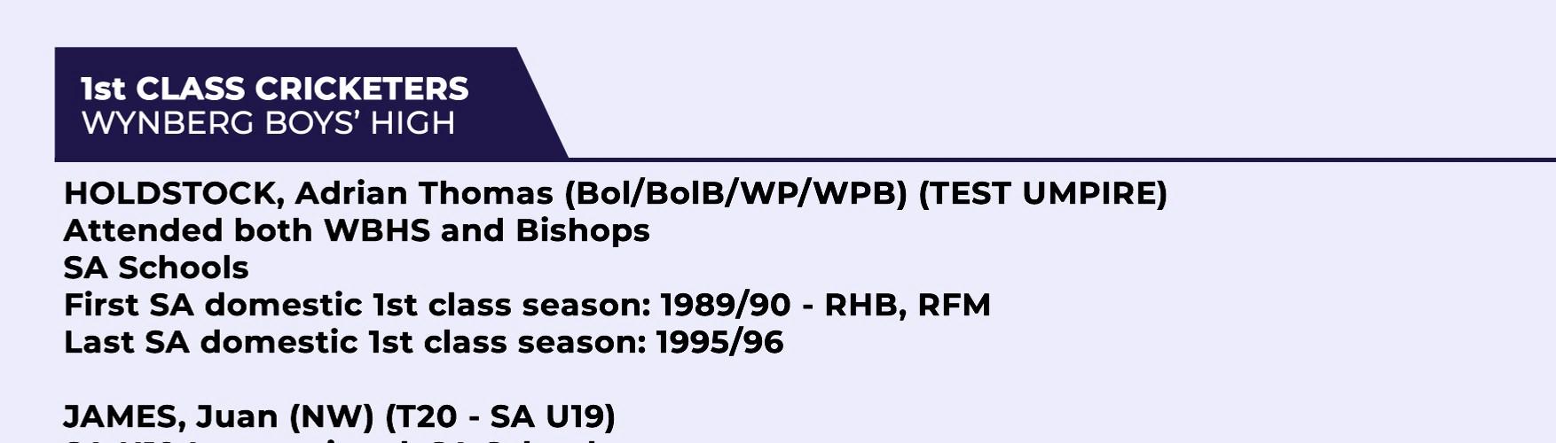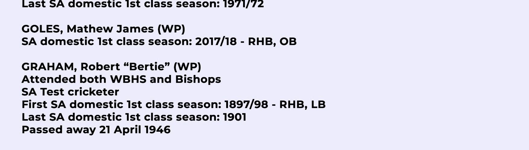 The full list of Wynberg Old Boys who've played first-class cricket, research courtesy Robin Isherwood. Register updated 6 December 2024: Matthew de Villiers debuts; we record the passing of Mike Bowditch; International status added for Jason Smith. #SuperaMoras