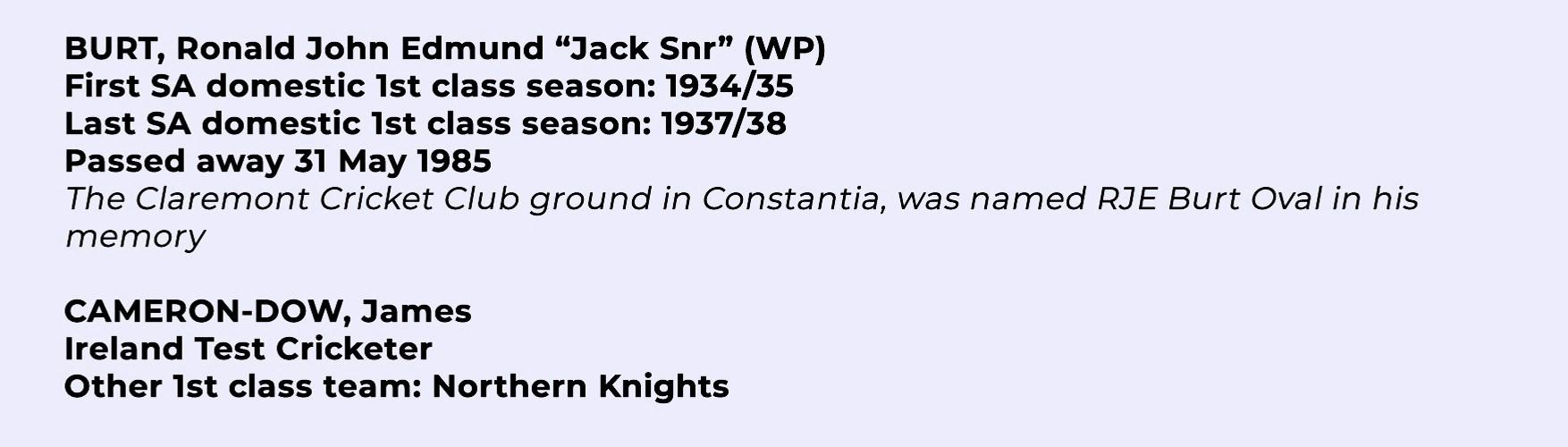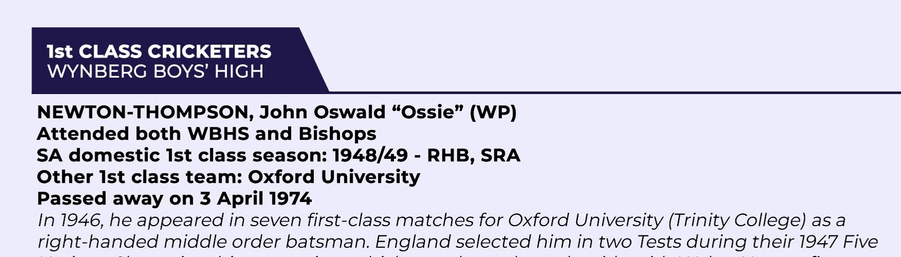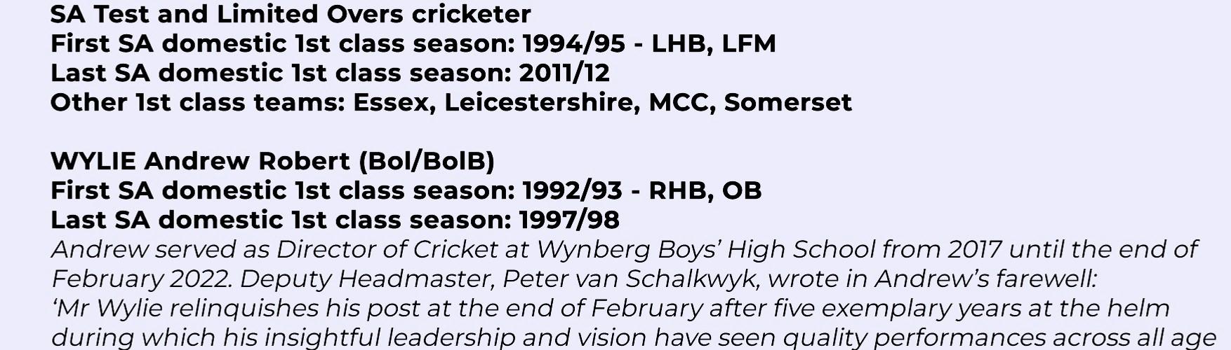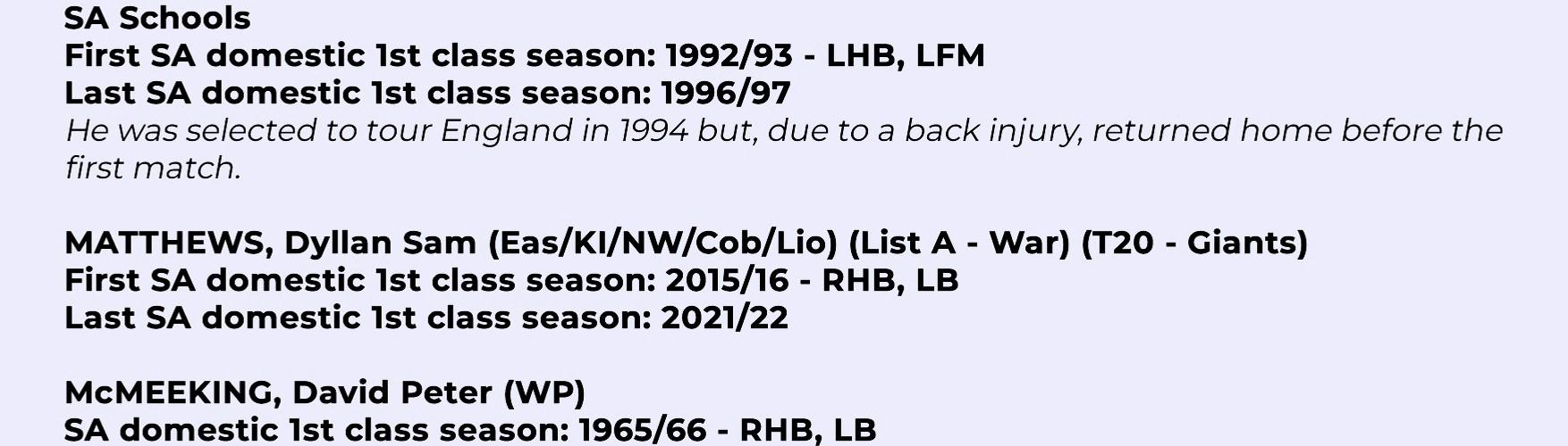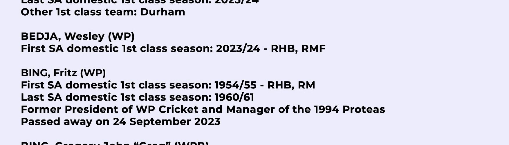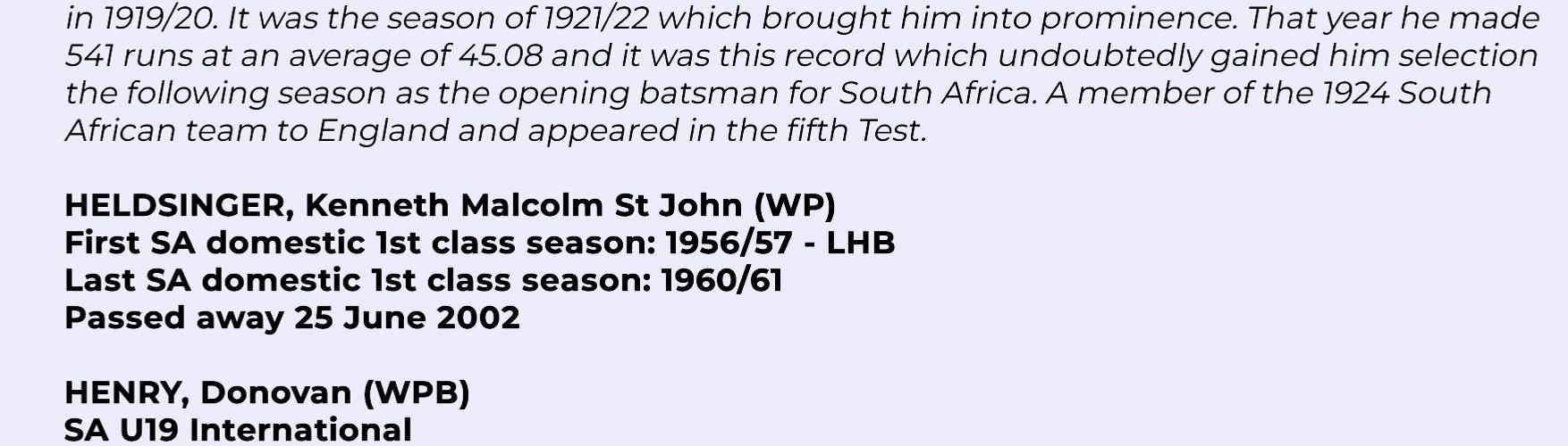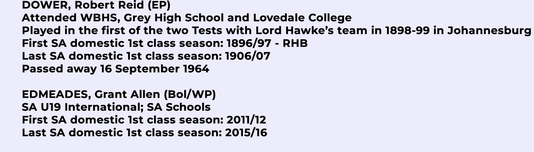 The full list of Wynberg Old Boys who've played first-class cricket, research courtesy Robin Isherwood. Register updated 6 December 2024: Matthew de Villiers debuts; we record the passing of Mike Bowditch; International status added for Jason Smith. #SuperaMoras