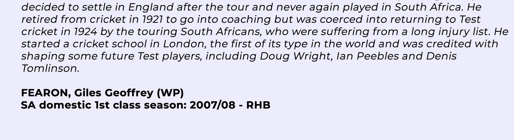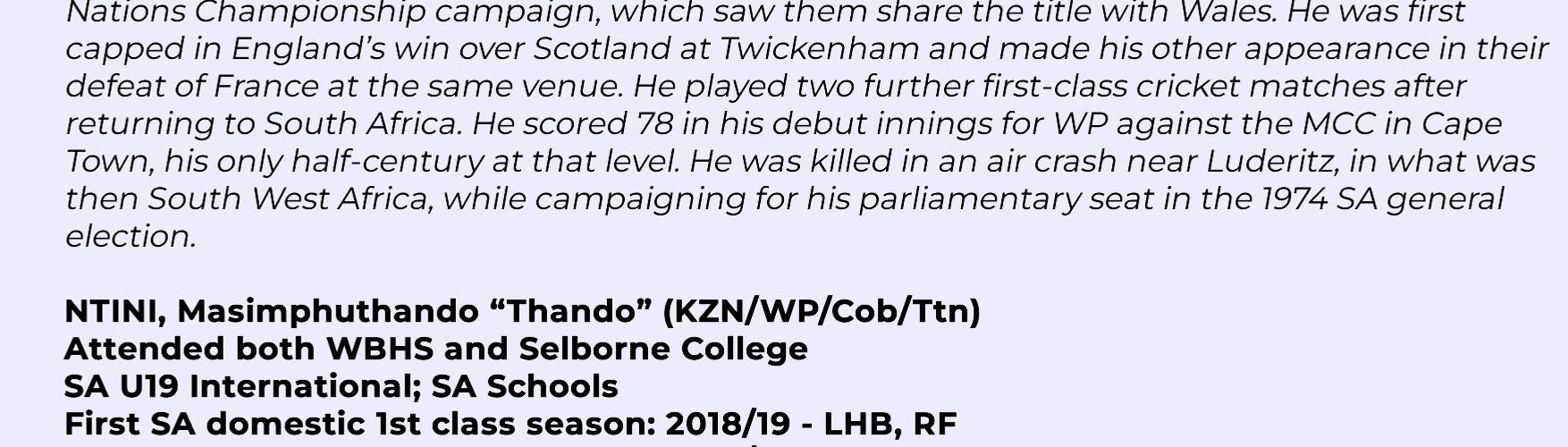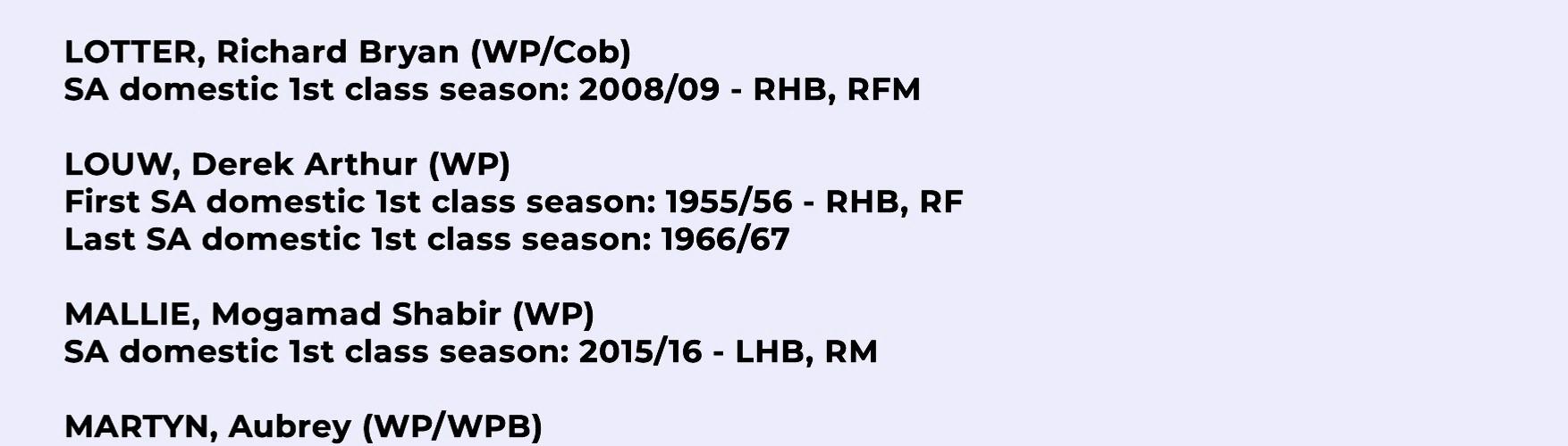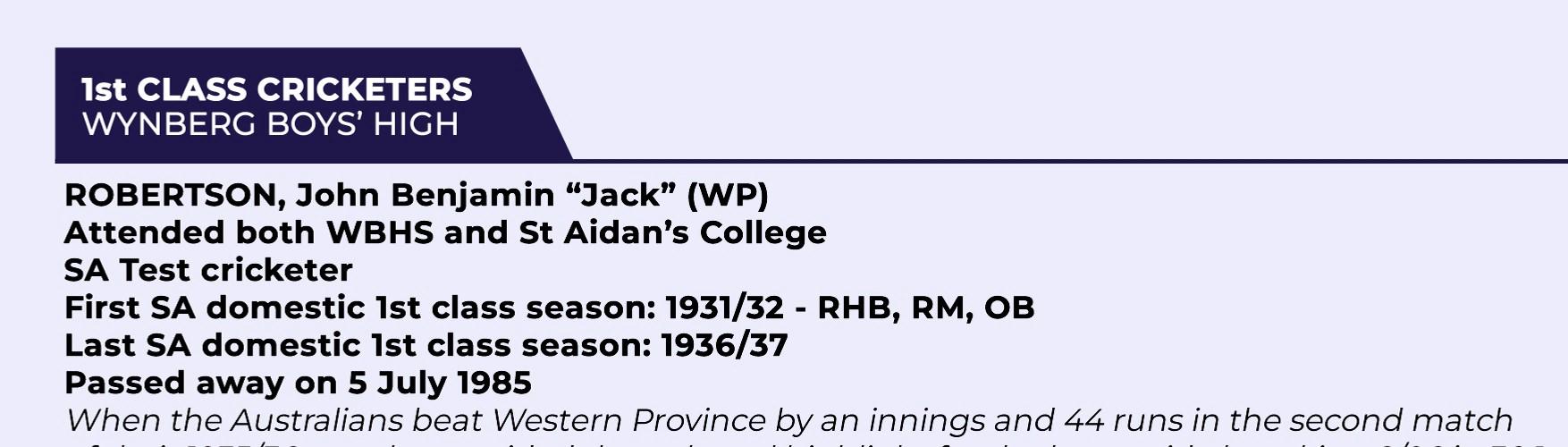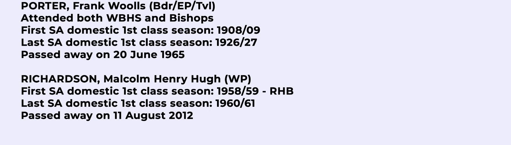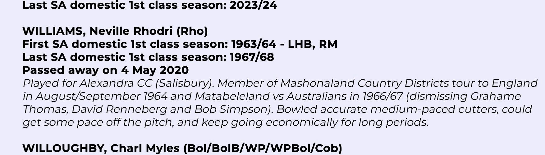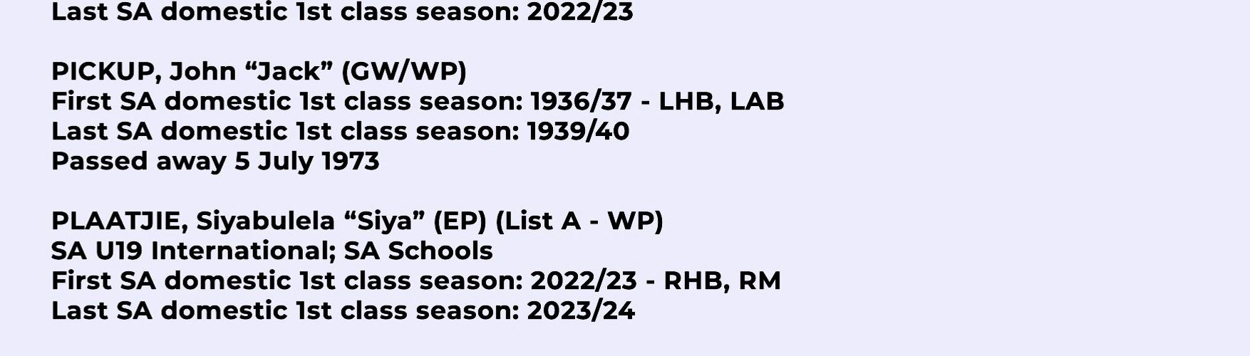 The full list of Wynberg Old Boys who've played first-class cricket, research courtesy Robin Isherwood. Register updated 6 December 2024: Matthew de Villiers debuts; we record the passing of Mike Bowditch; International status added for Jason Smith. #SuperaMoras