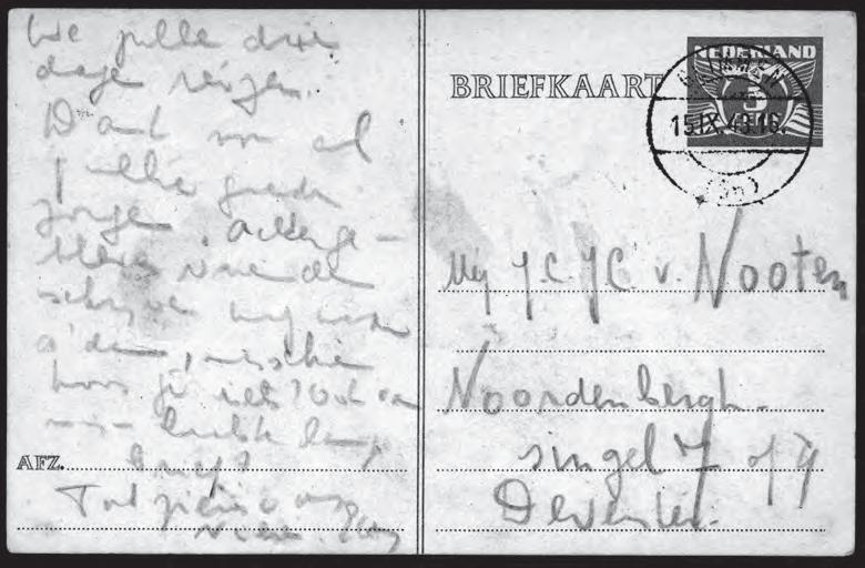Iet s voor de g ren s met Du it sla nd w ier p Et t y de k aa r t u it de t rei n met de hoopvolle wens dat iemand de kaar t zou v inden en zou posten.5 Ett y en haar fa milie, evena ls miljoenen lotgenoten, overleefden de naziverschr ik k ingen n iet .