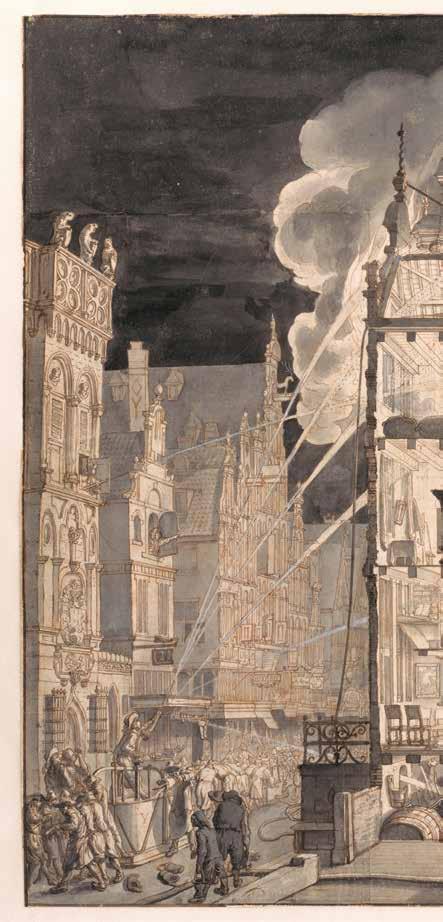 Waalseilandgracht (afb. 4.1). Buurtbewoners inspecteren met lantarens in de hand de smeulende resten. Dikke rookwolken stijgen op uit het puin en hier en daar zijn de vlammen weer opgelaaid. Enkele slachtoffers liggen bedolven onder een zijmuur die zojuist is ingestort. De andere aanwezigen vluchten in paniek voor een zijmuur die vervaarlijk naar voren helt. Op de gracht staat een brandspuit opgesteld, mogelijk als voorzorgsmaatregel.