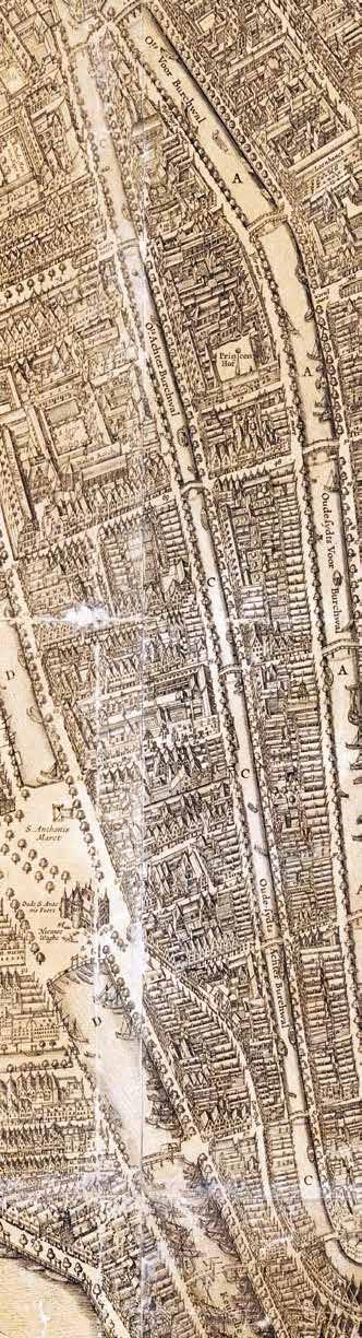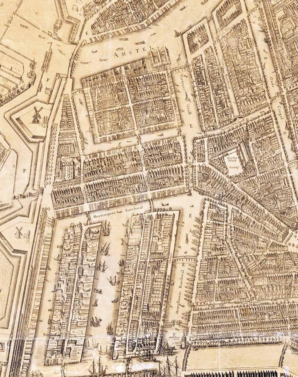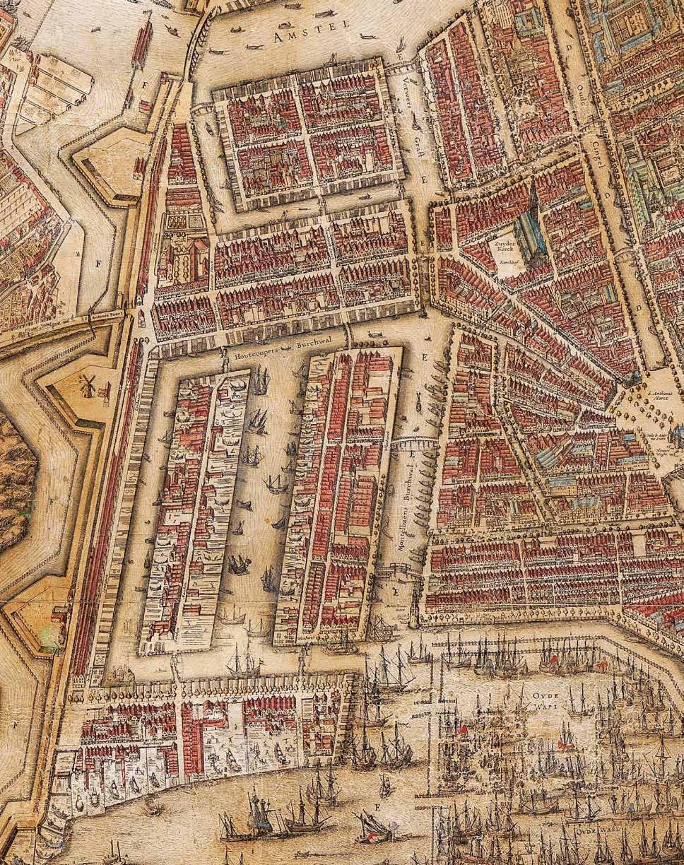 < Detail ingekleurde wandkaart van Amsterdam door Balthasar Florisz van Berckenrode rond 1630, met daarop de toenmalige Jodenbuurt: Vlooienburg, de Jodenbreestraat, Uilenburg en Marken.