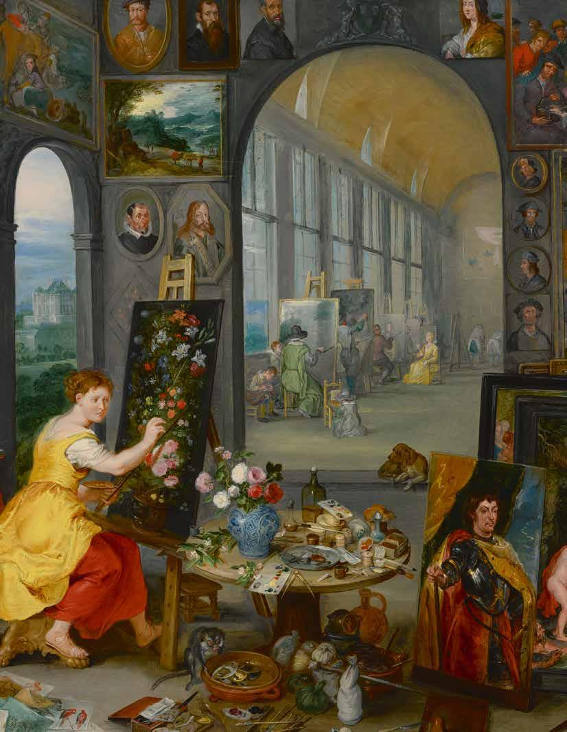 Kunstenaars met de naam Brueghel, die ook gespeld wordt als Bruegel en Breughel, speelden tussen 1550 en 1700 een vooraanstaande rol in de Europese kunstwereld.1 In die periode produceerden kunstenaars uit niet minder dan vijf generaties van de familie Brueghel werken die ook nu nog worden bewonderd om hun geestige en onderhoudende composities, uitzonderlijk vakmanschap en tijdloze, universele boodschap. Het gezamenlijke oeuvre van de familie Brueghel geeft een overzicht van veel van de belangrijkste ontwikkelingen in de vroegmoderne westerse kunst. Dit is te danken aan zowel de diversiteit aan onderwerpen (bekende spreekwoorden [afb. 1], boerentaferelen [afb. 2], verhalen uit de klassieke mythologie en de Bijbel, landschappen en studies van bloemen, dieren en insecten) als aan de diversiteit aan formaten, waaronder bankpasformaat schilderijen op koper [afb. 3] tot wandvullende doeken.