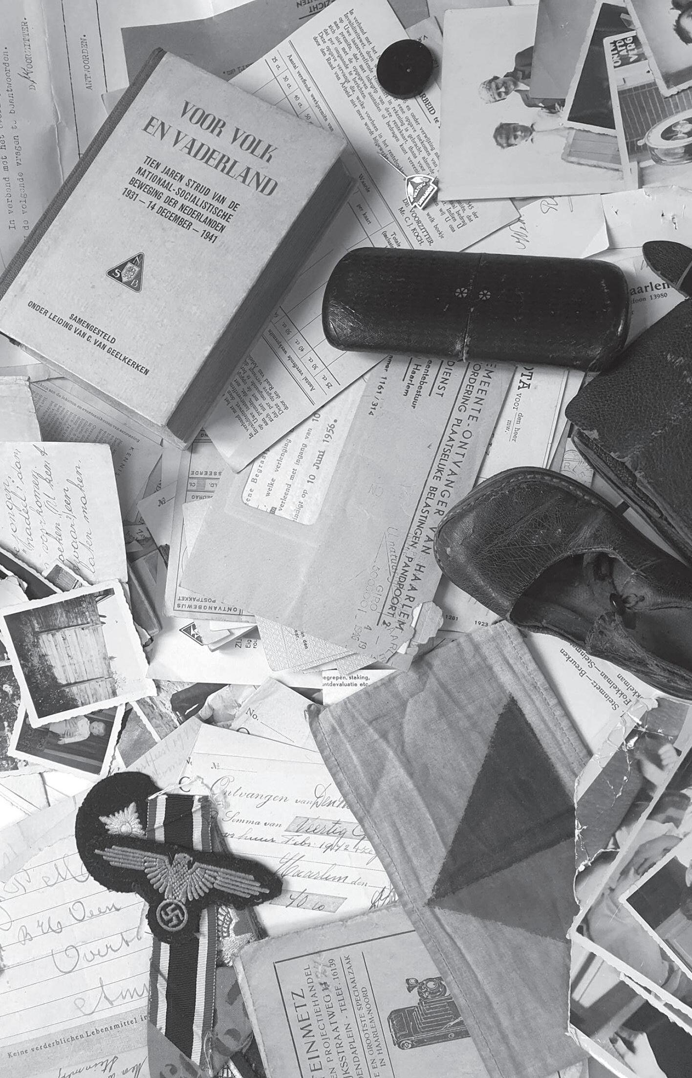 Willy, wie was zij? Het antwoord moest besloten liggen in de verzameling die zij zo hoog mogelijk in huis had verstopt. Stapels beduimelde enveloppen met onbekende adressen, overlijdensadvertenties, rekeningen, brieven uit oorlogstijd, nazi-insignes, nationaalsocialistische pamfletten. Er zaten voorwerpen tussen, waaronder een knoop, een katoenen identificatiearmband uit een kamp, een lege portefeuille, een pipet. Een maïzenaspeldje van Koopmans, een zwart lederen schoentje met doorgesleten zool en een plukje vlassig roodblond haar, bijeengehouden door een verroeste paperclip, wijzen op een kind dat in haar leven was.