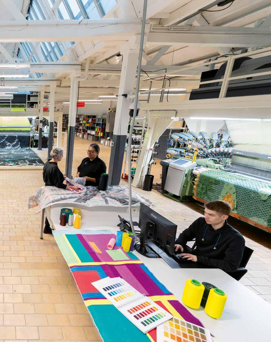 De computergestuurde weefmachine kan meer dan 12.000 kettingdraden afzonderlijk aansturen, waarmee complexe patronen van veschillende garen in de structuur van de stof worden geweven