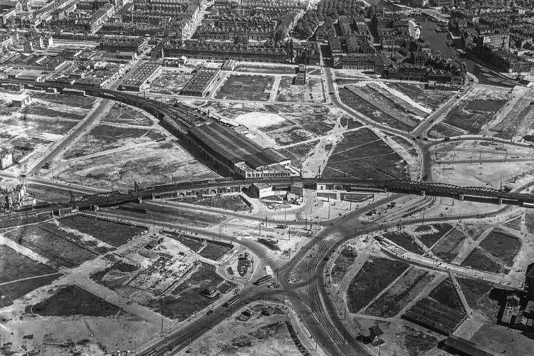 te klauteren, maar dan was de lol wel ongeveer op. Hoewel… je had aan één kant van de hal ook nog een loket, al was dat vrijwel nooit open. Daar maar eens kijken. Door het venster kon je binnen in de ruimte twee grote ingelijste foto’s zien hangen. Ze toonden allebei een deel van de stad en als je even beter keek, zag je bij beide ongeveer in het midden hetzelfde grote, langwerpige bouwwerk. Dat moest toch ook het station Hofplein zijn? Alleen was het op één foto veel ouderwetser, doordat er een mooi rond gebouw voor stond, met markiezen. Maar wat opvallender was, op die ene foto werd het station omgeven door allemaal huizen en een levendige drukte, terwijl het op de andere in een naargeestige, grotendeels lege vlakte lag. Wat was hier gebeurd? Ik kon het niet begrijpen en de uitleg van mijn moeder was voor mij ook niet echt te vatten. Ik weet nu meer, maar de verbazing is altijd gebleven. Ik wil daarvan graag het een en ander laten zien en daarbij wat vertellen. Want ook in de doorgeleerde vakhistoricus holt nog steeds dat nieuwsgierige jongetje rond.