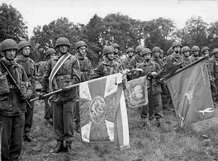 ↓ De vaandelwacht van de 1e Poolse Onafhankelijke Parachutistenbrigade presenteert op 15 juni 1944 de vaandels van de brigade, met vooraan het zojuist uit Polen ontvangen vaandel.