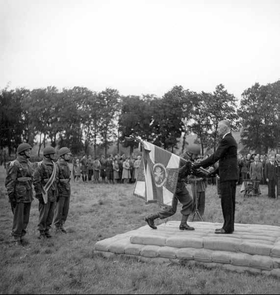 ← Stanisław Sosabowski ontvangt het vaandel van de 1e Poolse Onafhankelijke Parachutistenbrigade uit handen van president Raczkiewicz tijdens een officiële ceremonie in juni 1944.