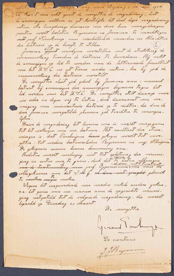 Thus, on 5 March 1926, “an association of university historians” was founded, without a name.7 According to the founding minutes, one of the founders, T.S. Jansma, suggested that all history students should become members of the Literary Faculty of USC.8 However, this measure failed to accumulate enough votes from the 19 members present. The new association thus did not join the larger student fraternity, which often revolved around ceremony and ritual, and in its early years remained “a sober