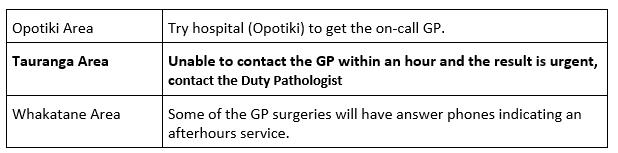 • Our staff contact the Duty Pathologist – Ensuring all details are given to Pathologist (Patient name etc., together with results & potential contact phone number (After hour service / GP or Hospital AE phone number and 'hand over' issue.)