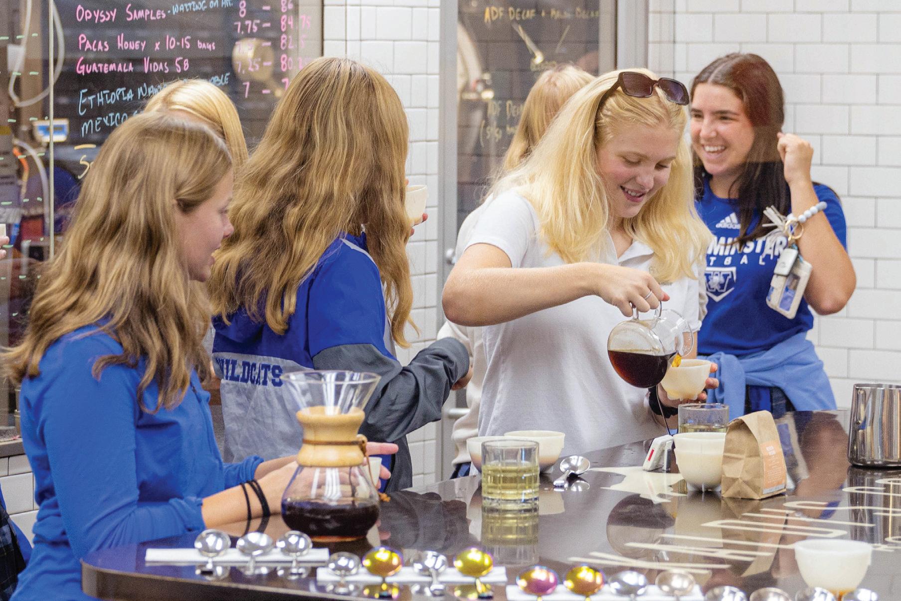 Recently, the senior entrepreneurship class running Pawprint Coffee visited Kaldi’s Coffee headquarters in downtown St. Louis. Kaldi’s has been supplying Pawprint with ingredients and supplies since the coffee shop first opened in the school in 2017 and has been a crucial partner ever since. The trip to Kaldi’s HQ was fun and educational for our students. They learned more about where their coffee supplies come from and about pursuing sustainability, building relationships, and restoring the world through business.