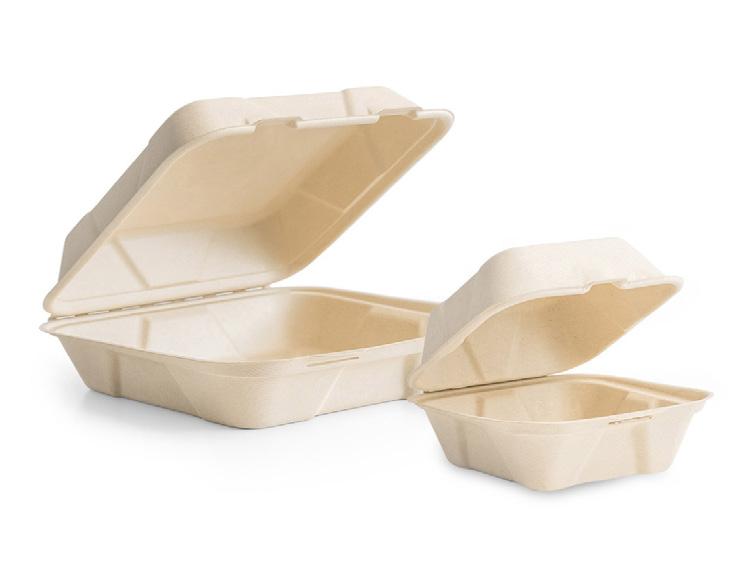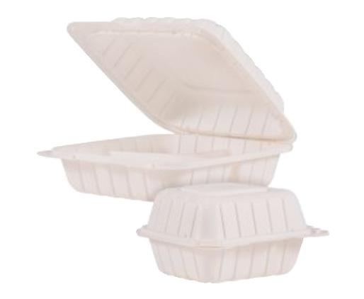 Nourish clamshell containers are made with reclaimed natural fibers. Freezable and microwavable. BPI Certified compostable with no intentionally added PFAS.
