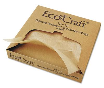 Grease resistant paper provides stain protection. EcoCraft® wraps are packaged in 100% post-consumer recycled cartons. Sustainable alternative to cartons and plastic containers.