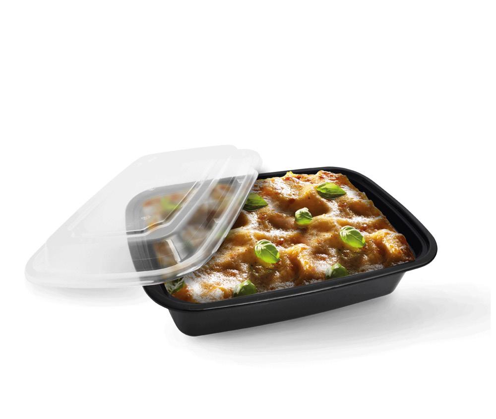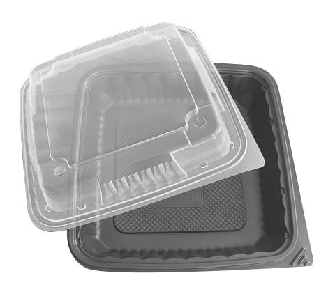 These two-piece polypropylene to go containers are microwavable and freezer safe. The stackable secure seal locking system prevents leaks, and the anti-fog clear lid offers a great presentation for any meal. The natural mineral content reduces the total amount of plastic for those eco-conscious users. Black base with clear lid.