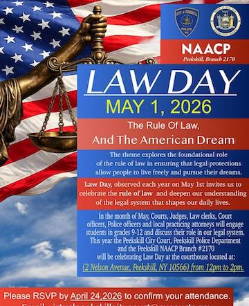 May 1st - Law Day! The Rule of Law And the American Dream. In the month of May, Courts, Judges, Law clerks, Court officers, Police officers and local practicing attorneys will engage students in grades 9-12 and discuss their role in our legal system. This year the Peekskill City Court, Peekskill Police Department and the NAACP, Peekskill Branch #2170 will be celebrating Law Day at the courthouse located at: 2 Nelson Avenue, Peekskill NY from 12-2 p.m.