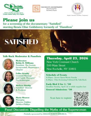 The Greater Hudson Valley (NY) Chapter of The Links, Incorporated, in partnership with The Society, Incorporated – Renaissance Chapter and the Women’s Leadership Institute, will host a screening of the documentary “Satisfied,” starring Renée Elise Goldsberry of Hamilton, on Thursday, April 23, 2026 at New York Covenant Church, 500 Main Street, New Rochelle. Doors open at 6:00 p.m. with the film beginning at 6:30 p.m., followed by a panel discussion titled “Dispelling the Myths of the Superwoman.” Tickets: Early Bird 2-for-1 ($50) through April 12; General Admission $30. Register on Eventbrite Link: https://ghvsatisfiedfilmscreening. eventbrite.com/