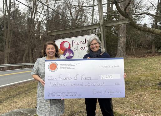 WHITE PLAINS, NY—Westchester County Legislator Erika L. Pierce (D–Bedford, Lewisboro, Mount Kisco, North Salem, Pound Ridge, Somers) presented $21,600 in County funding to Friends of Karen, a North Salem-based nonprofit that assists families with children facing life-threatening illnesses. Pierce delivered a ceremonial “big check” on behalf of the Board of Legislators, affirming the Board’s commitment to uplift the County’s children and families.