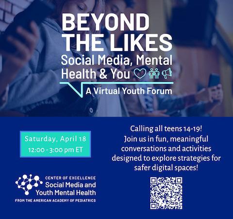 The American Academy of Pediatrics Center of Excellence on Social Media and Youth Mental Health invites teens (ages 14-19) to participate in Beyond the Likes - Social Media, Mental Health & You, a free virtual youth forum on Saturday, April 18, from 12:00 pm to 3:00 pm ET. This interactive event will empower young people to navigate the digital world with confidence, engage in meaningful conversations with peers and ex-