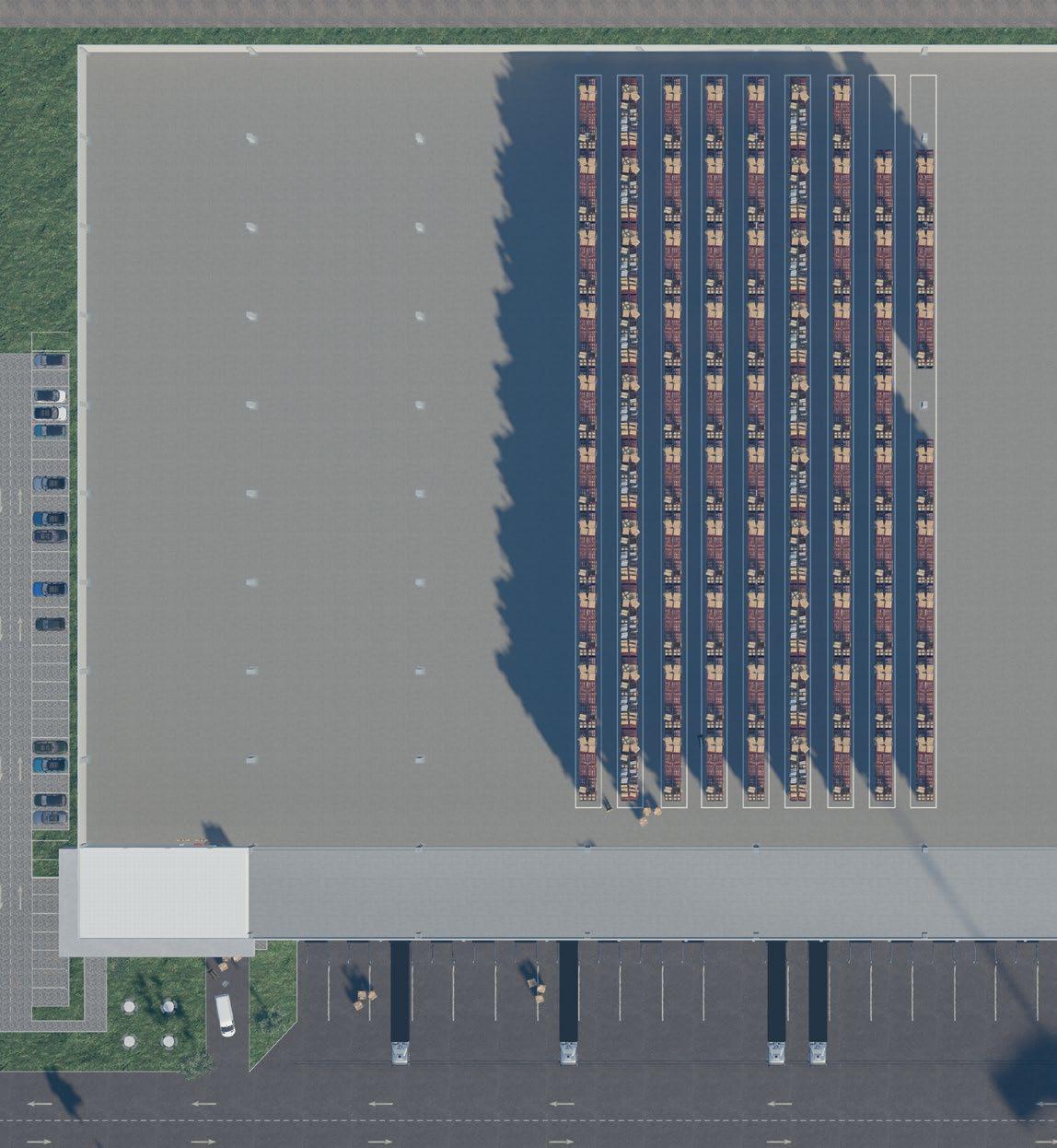 Het magazijn is zo ontworpen dat er per overspanning 8 rekken geplaatst kunnen worden met extra brede gangen van 3,2 m breed. Met een vrije hoogte van 12,2 m wordt de ruimte optimaal benut en kunnen 5 of 6 palletniveaus gestockeerd worden. Verder is het magazijn volledig gesprinklerd, verwarmd en verlicht met LED-lichtlijnen.
