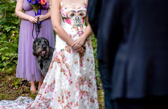 Neither saw the other before the big reveal as Genevieve’s father walked her down the aisle at the beginning of the ceremony. Andrew, as well as the gathered guests, were stunned by Genevieve’s unique and colorful wedding dress. It spoke to the uniqueness of their union and their plans for the day ahead. Their dog Bear walked Genevieve’s maid of honor down the aisle, and was as much a part of the wedding as his human counterparts.