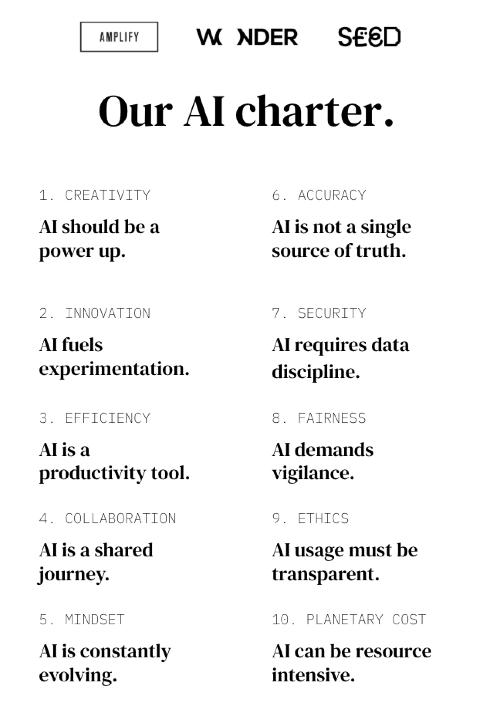 We developed our frst AI charter that sets out 10 guiding principles alongside our sibling agencies Wonder and Seed. It outlines our commitment to using AI as a tool to enhance human capability rather than replace it, emphasising ethical, secure and transparent practices. We also established our AI task force, set up to drive responsible AI adoption. It is made up of a dedicated collective of individuals from across the agency group, established to action our AI charter with a focus on our People, Practice and Planet pillars.