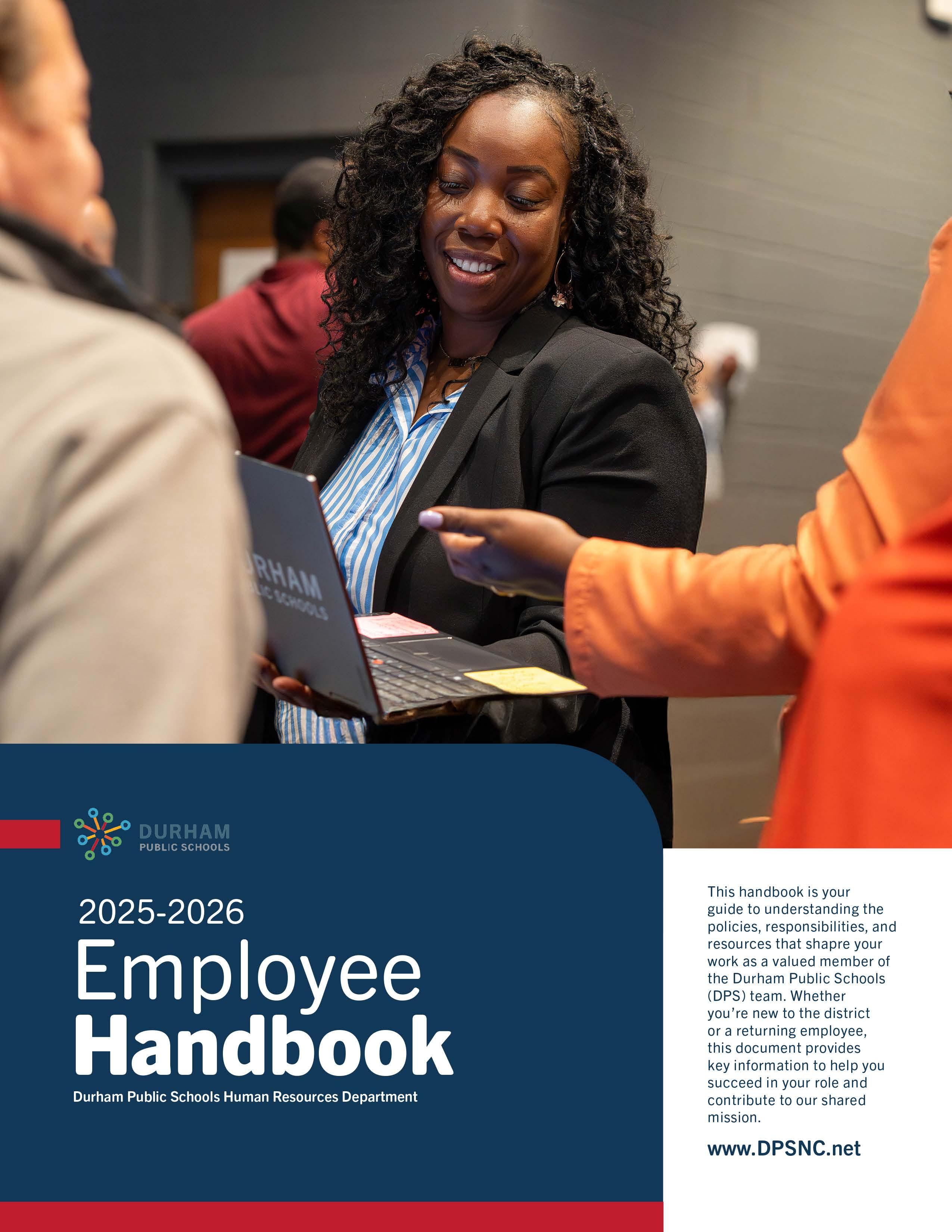 This online Employee Handbook provides information about employee rights and responsibilities related to employment with Durham Public Schools (DPS). These rights and responsibilities are based on state and federal law, Board Policies and/or district practices, and it is the employee’s responsibility to be familiar with and comply with all these rules and regulations. Although the Employee Handbook summarizes many detailed provisions about employment, benefits, and other related matters, the official policies, laws, regulations, and procedures will always govern when questions arise. DPS Board Policies are located here and are aligned with other NC public school districts associated with the North Carolina School Boards Association. The contents of this handbook are not intended to create or imply any contract rights or additional benefits beyond what is provided by law or policy.