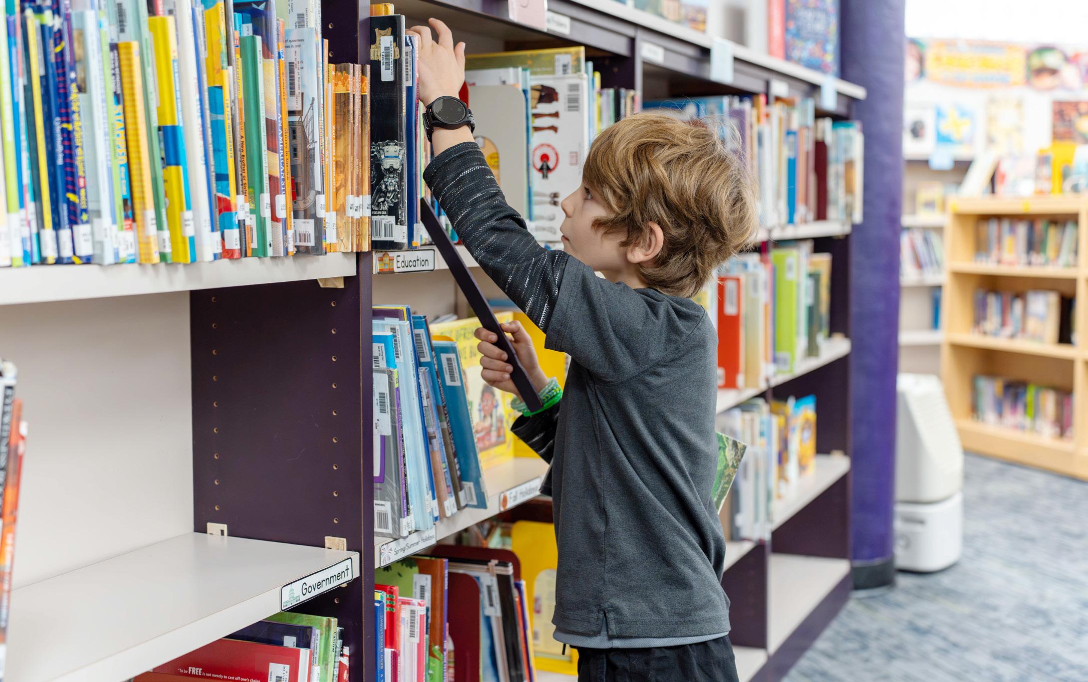 Un joven lector explora las estanterías, uno de los miles de recursos impresos y digitales a disposición de los estudiantes de las Escuelas