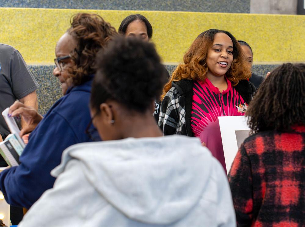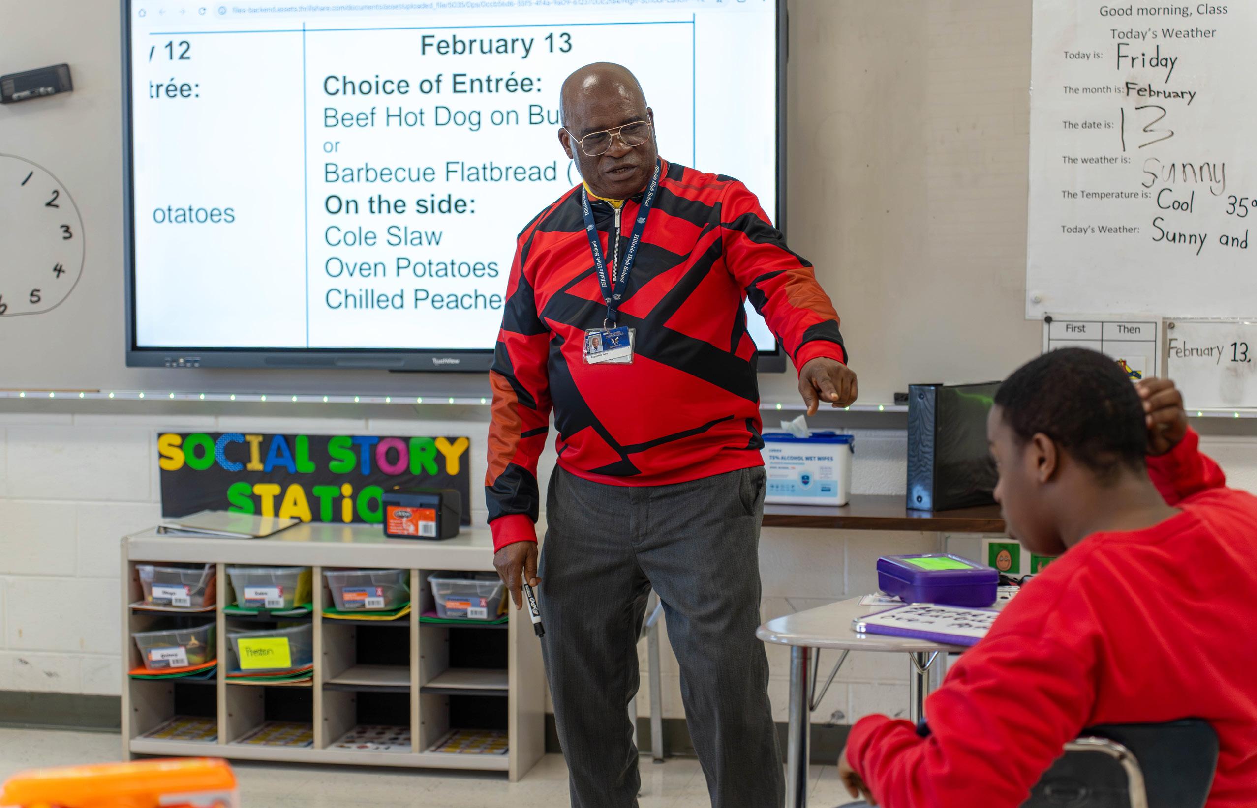 ARRIBA Augustine Sanu, maestro de niños con necesidades especiales, repasa el menú del almuerzo con su clase antes de que salgan a comer. ABAJO Verónica Ochoa-Castillo, maestra de arte y fotografía, trabaja junto a sus estudiantes en un proyecto artístico colaborativo, aportando su propia contribución a la obra conjunta.
