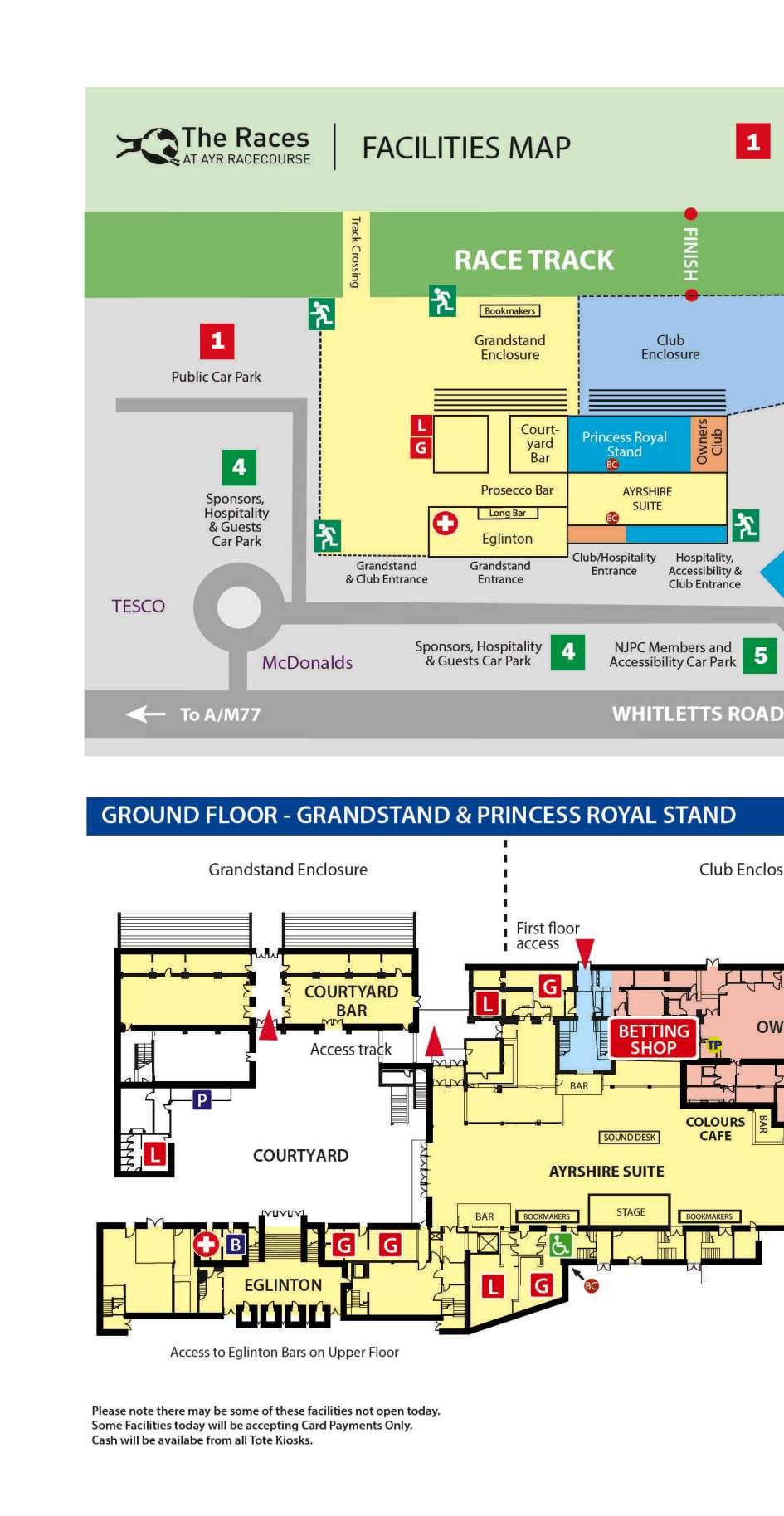 L G P B Toilet Ladies Toilet Gents Accessibility Toilet Aid First Office Police Manager Betting tote pool Facilities Grandstand Facilities Club Hospitality/Private Warrio Roman - Floor 2nd 12 to 7 Boxes - Floor 3rd Baby Changing Facilities & Accessibility Toilets CLUB NERS ure First floor access STAND ROYAL PRINCESS - FLOOR FIRST G L BETTING SHOP Access track UPPER CHANCELLOR LOWER CHANCELLOR VIEWING Enclosure Club floor First access BAR 27 PRINCESS ROYAL SUITE Second Floor - Princess Royal Stand Roman Warrior Restaurant Third Floor - Princess Royal Stand Princess Royal Hositality Suites SILKS CAFE CR AIGIE RO AD To St at ion Centre Town Ayr To Horse Boxes 3 Western Hotel House Stables G L PARADE RING Wi nners Enclosur e Champagne Lawns L G yBeFriendl Bar Weighing Room Sa ddling Bo xe s Enclosure Club Rothesay Stand CENTRE OF COURSE CAR PARK Coaches, Minibuses, Officials, Members & Public Owners & Trainers Entrance House Western Residents, & Owners Trainers 2 Paddock Lawn Marquee VehicleCrossingPoint Club Ow ners Tr ainers & Hospitalit y En tr anc e Bo ok makers DrinkFood& Vendors Unite Private Bar Legends Lounge Club Bar Winning Connections Champagne Bar