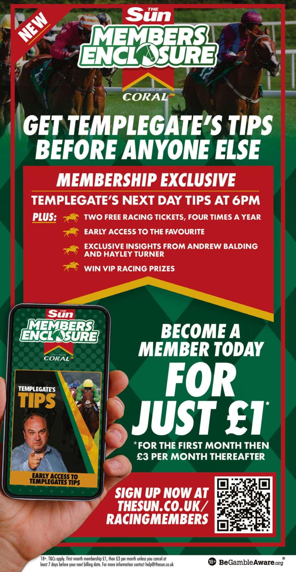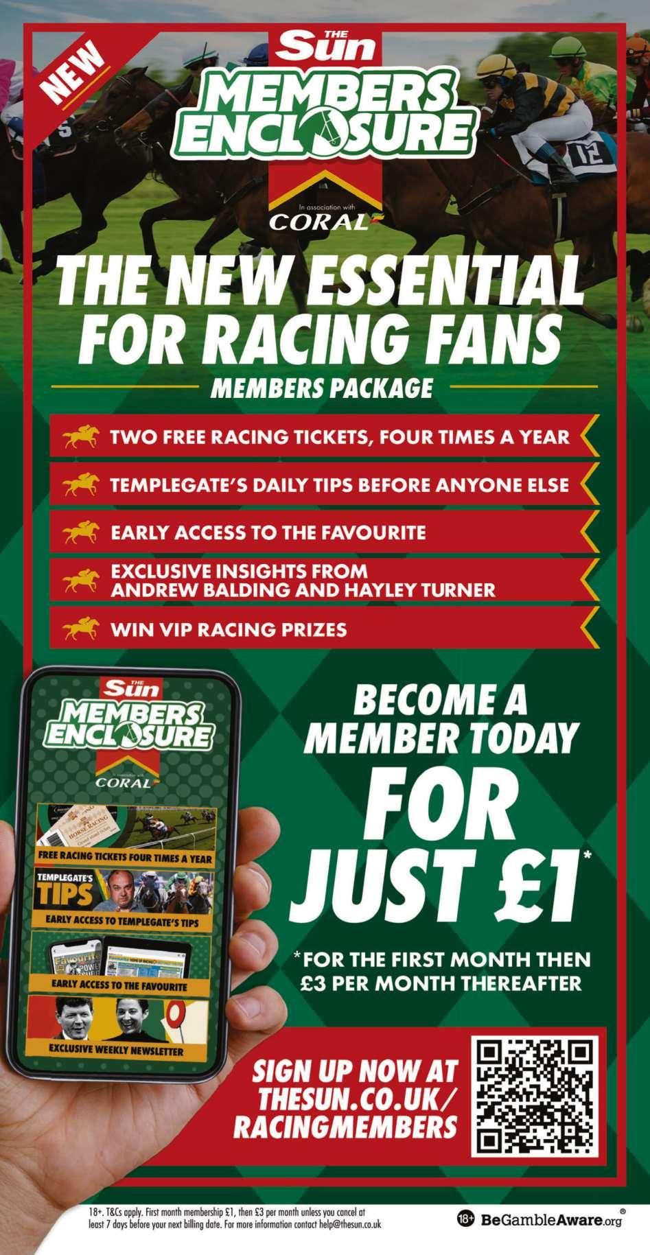 Third Race 7.12 - THE thescottishsun.co.uk HANDICAP STAKES (CLASS 5) Distributed in accordance with the Stakes and Prize Money Code. £5234 to the winning horse The second to receive £2456, the third £1227, the fourth £614 and the fifth £306 for three yrs old and upwards, Rated 56-75 (also open to such horses rated 76 and 77; such horses rated 55 and below are also eligible - see Standard Conditions). £36 stake if the horse is rated 56 or higher, or £7 stake if the horse is rated 55 or lower with £29 extra if the horse is declared to run Declare by 10.00 a.m. August 8th. Lowest weight: 4-y-o and up 8st 11lb; 3-y-o 8st 3lb Highest weight: 4-y-o and up 10st 2lb; 3-y-o 9st 8lb Penalties, after August 3rd, 2024, for each race won 3yo 6lb; 4yo to 6yo 5lb; 7yo and up 4lb. THE SCOTTISH SUN has generously sponsored this race and will present a memento to the winning owner and a cash prize to the stable employee in charge of the best turned out horse in this race. All number cloths to be carried in this race have been sponsored and will carry the name/logo of SCOTTISH SUN The sponsorship payment of £250 will be distributed equally amongst all horses starting in this race in accordance with paragraphs 24 to 27 of the Stakes and Prize Money Code. 19 entries at £36 - Closed August 5th, 2024. Owners Prize Money Winner £4129; Second £2065; Third £1032; Fourth £516; Fifth £258. (Penalty Value £5234) SS SEE PAGE 24 FOR THIS RACE.