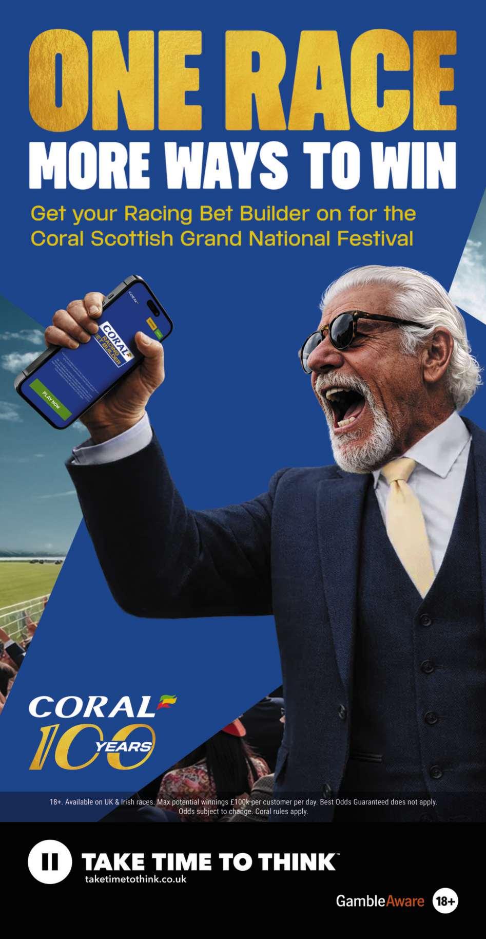 Fifth Race 3.35 - THE CORAL SCOTTISH GRAND NATIONAL HANDICAP STEEPLE CHASE (CLASS 1) (PREMIER HANDICAP) (GBB RACE) Distributed in accordance with the Stakes and Prize Money Code. £112540 to the winning horse The second to receive £42400, the third £21220, the fourth £10600, the fifth £5320, the sixth £2660 the seventh £1320 and the eighth £680 for five yrs old and upwards. Enter by noon, March 31st and pay £300 stake, Confirm by noon, April 13th and pay £700, Declare by 10.00 a.m. April 16th. Penalties, after April 5th, 2026, for each steeple chase won 7lb No penalty to increase a horse’s weight above 12st. CORAL has generously sponsored this race and will present the Scottish Grand National Challenge Trophy to be retained by the executive, and a memento to the winning owner CORAL will also present a memento to the winning trainer and jockey They will also present a cash prize of £150 to the stable employee in charge of the best turned out horse in this race. All number cloths to be carried in this race have been sponsored and will carry the name/logo of CORAL. The sponsorship payment of £500 will be distributed equally amongst all horses starting in this race in accordance with paragraphs 24 to 27 of the Stakes and Prize Money Code. PLEASE NOTE: A novice horse shall only be qualified to run in this race if it has run a minimum of three times in Steeple Chases in Great Britain, Ireland or France in accordance with paragraph 15 of the Weights and Handicapping Code This race will be restricted to 30 runners plus two reserves. The two reserves will be nominated as R31 and R32. The procedure for the allocation and operation of the reserves protocol will be as detailed in the notice headed ‘Reserves’ which has been published in The Racing Calendar and which also appears in the important notices following the Standard Conditions on the Racing Bulletin area of the BHA Racing Administration Internet site www2.racingadmin.co.uk. Trainers are reminded of the provisions of paragraph 41 of the Race Entry Code which require that they MUST notify the Racing Calendar Office IMMEDIATELY when the decision has been made not to run. This will maximise the list of runners and determine whether the weights will need to be raised. The British Horseracing Authority will modify the Rules of Racing as a consequence of providing two reserves for the Coral Scottish Grand National Handicap Steeple Chase. The penalty referred to under Rule will be waived for any horse which is deemed a non-runner by 1.00pm on the day before the race. The British Horseracing Authority has modified paragraph 6 of the Weights and Handicapping Code for the purposes of this race, such that racecourse performances up to and including the Sunday after Closing may be taken into account. The British Horseracing Authority has modified the Declaration of Jockey section of the Race Entries Code and the Division of Races section of the Race Administration Code of the Rules of Racing for the purposes of this race. 49 entries, 24 at £300, 25 at £1000 - Closed March 31st, 2026 Owners Prize Money Winner £86080; Second £35480; Third £17740; Fourth £8880; Fifth £4440; Sixth £2220; Seventh £1100; Eighth £560. (Penalty Value £112540) Weights raised 22lb and paragraph 34 of the Weights and Handicapping Code complied with where applicable.