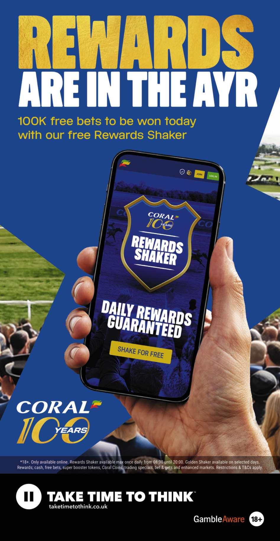 Third Race 2.20 - THE CORAL SCOTTISH CHAMPION HURDLE RACE (A LIMITED HANDICAP) (CLASS 1) (Grade 2) (GBB RACE) Distributed in accordance with the Stakes and Prize Money Code. £56270 to the winning horse The second to receive £21200, the third £10610, the fourth £5300, the fifth £2660, the sixth £1330, the seventh £660 and the eighth £340 for four yrs old and upwards. Enter by noon, March 31st and pay £125 stake, Confirm by noon, April 13th and pay £375, Declare by 10.00 a.m. April 16th. Lowest weight 10st 6lb; Highest weight 11st 12lb Penalties, after April 5th, 2026 for each hurdle race won 6lb No penalty to increase Horse’s weight above 11st 12lb. Coral has kindly sponsored this race and will present a memento to the winning owner trainer and jockey All number cloths to be carried in this race have been sponsored and will carry the name/ logo of Coral. The sponsorship payment of £500 will be distributed equally amongst all horses starting in this race in accordance with paragraphs 24 to 27 of the Stakes and Prize Money Code. PLEASE NOTE: A novice or juvenile horse shall only be qualified to run in this race if it has run a minimum of four times in Hurdle races in Great Britain, Ireland or France in accordance with paragraph 15 of the Weights and Handicapping Code The British Horseracing Authority has modified paragraph 6 of the Weights and Handicapping Code for the purposes of this race, such that racecourse performances up to and including Sunday after Closing, may be taken into account. 34 entries, 16 at £125 18 at £500 - Closed March 31st, 2026 Owners Prize Money Winner £43040; Second £17740; Third £8870; Fourth £4440; Fifth £2220; Sixth £1110; Seventh £550; Eighth £280. (Penalty Value £56270) Weights raised 2lb and paragraph 34 of the Weights and Handicapping Code complied with where applicable.